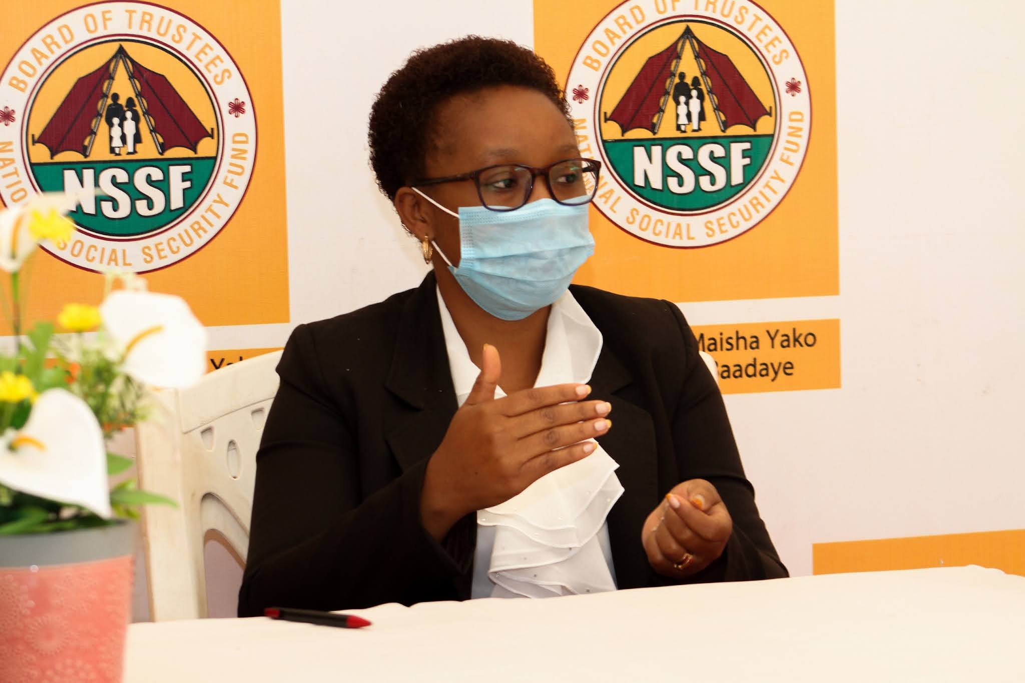 Afisa Mwandamizi Uhusiano wa NSSF Rachel Hosea (kulia) akimsikiliza kijana Edwin Mitumba (wa pili kushoto) alipokuwa akimuuliza maswali Afisa huyo juu ya mambo mbalimbali za Mfuko huo.