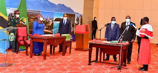 Rais wa Jamhuri ya Muungano wa Tanzania Mheshimiwa Samia Suluhu Hassan akimuapisha Lilian Leonard Mashaka kuwa Jaji wa Mahakama ya Rufani katika hafla ya Uapisho wa Majaji hao iliyofanyika Ikulu Jijini Dar es Salaam leo tarehe 17 Mei, 2021.