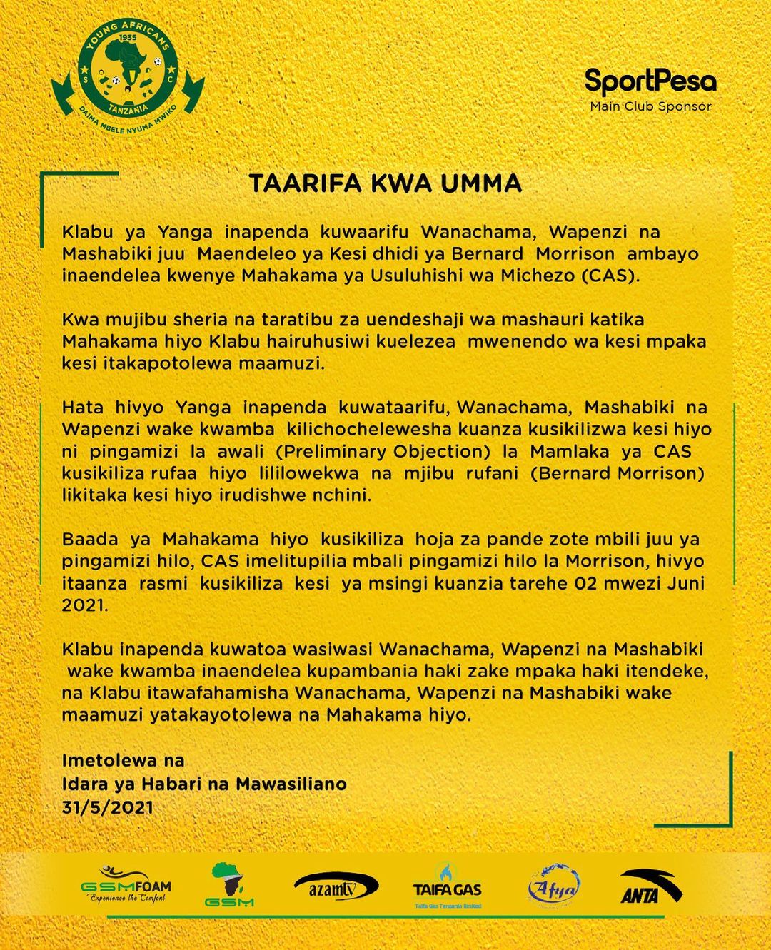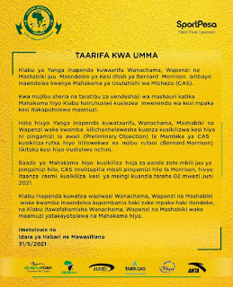 Home SPORTS MAHAKAMA YA CAS KUSIKILIZA KESI YA YANGA DHIDI YA MORRISON JUNI 2. MAHAKAMA YA CAS KUSIKILIZA KESI YA YANGA DHIDI YA MORRISON JUNI 2. By Joseph Nelson - May 31, 2021 FacebookTwitterTelegramWhatsAppCopy URL Thank you for reading this post, don't forget to subscribe! MAHAKAMA ya Usuluhishi wa Kimataifa ya Michezo (CAS) imetupilia mbali pingamizi la winga Mghana, Bernard Morrison kutaka kesi iliyofunguliwa na Yanga dhidi yake itupwe.