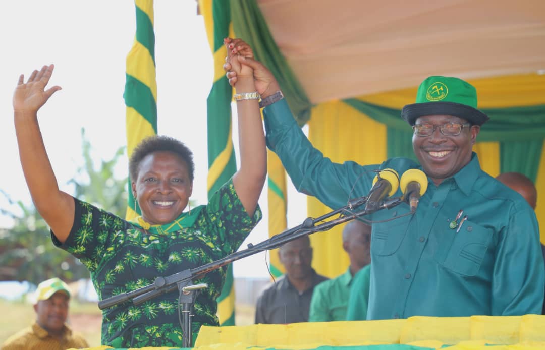 Mjumbe wa Kamati Kuu ya Halmashauri Kuu ya Taifa ya Chama cha Mapinduzi CCM na Makamu wa Rais wa Jamhuri ya Muungano wa Tanzania Mhe. Dkt. Philip Isdor Mpango, akimnadi Mgombea Ubunge Jimbo la Muhambwe Wilayani Kibondo MKoani Kigoma Dkt. Florence Samizi kwenye Mkutano wa Kampeni za Chama cha Mapinduzi CCM kwa ajili ya Uchaguzi Mdogo unaotarajiwa kufanyika tarehe 16 Mei 22021, kufuatia kifo cha aliyekuwa Mbunge wa Jimbo hilo Hayati Atashasta J Nditiye leo Mei 14,2021.