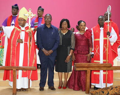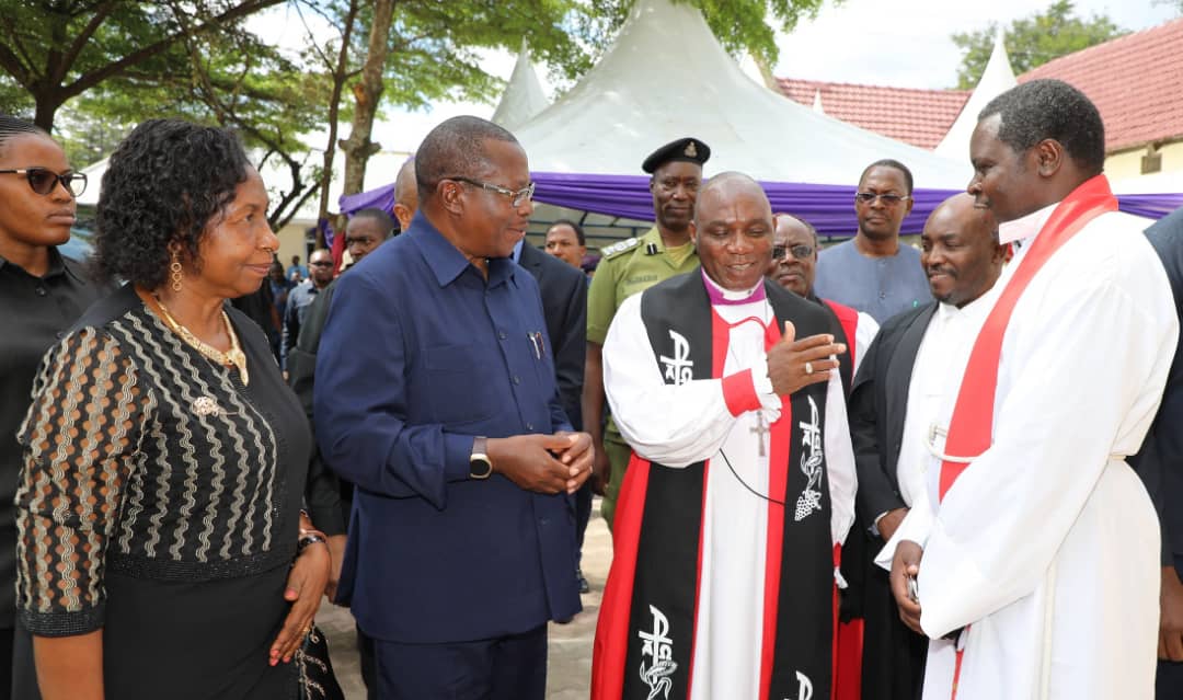 Makamu wa Rais wa Jamhuri ya Muungano wa Tanzania Mhe. Dkt. Philip Isdor Mpango, akisalimiana na Baadhi ya Maaskofu wa Kanisa la Anglikana Tanzania alipowasli katika Kanisa la Anglikana Jijini Mwanza wakati alipomuwakilisha Rais wa Jamhuri ya Muungano wa Tanzania Mhe. Samia Suluhu Hassan kwenye Sherehe ya kuwekwa Wakfu Askofu wa Tano wa Dayosisi ya Victoria Nyanza, iliyofanyika leo Mei 16,2021 katika Kanisa la Anglikana Jijini Mwanza.kulia ni Mama Mbonimpaye Mpango.