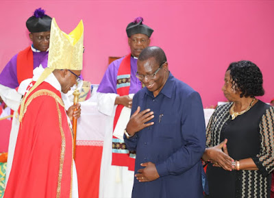 Makamu wa Rais wa Jamhuri ya Muungano wa Tanzania Mhe. Dkt. Philip Isdor Mpango, akiagana na Askofu Mkuu wa Kanisa la Anglikana Tanzania Mhashamu Maimbo William Mndolwa wakati alipomuwakilisha Rais wa Jamhuri ya Muungano wa Tanzania Mhe. Samia Suluhu Hassan kwenye Sherehe ya kuwekwa Wakfu Askofu wa Tano wa Dayosisi ya Victoria Nyanza, iliyofanyika leo Mei 16,2021 katika Kanisa la Anglikana Jijini Mwanza.kulia ni Mama Mbonimpaye Mpango.