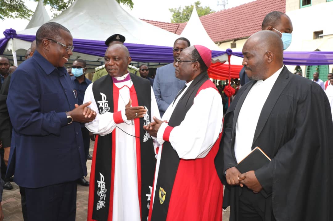 Makamu wa Rais wa Jamhuri ya Muungano wa Tanzania Mhe. Dkt. Philip Isdor Mpango, akiagana na Askofu Mkuu wa Kanisa la Anglikana Tanzania Mhashamu Maimbo William Mndolwa wakati alipomuwakilisha Rais wa Jamhuri ya Muungano wa Tanzania Mhe. Samia Suluhu Hassan kwenye Sherehe ya kuwekwa Wakfu Askofu wa Tano wa Dayosisi ya Victoria Nyanza, iliyofanyika leo Mei 16,2021 katika Kanisa la Anglikana Jijini Mwanza.kulia ni Mama Mbonimpaye Mpango.