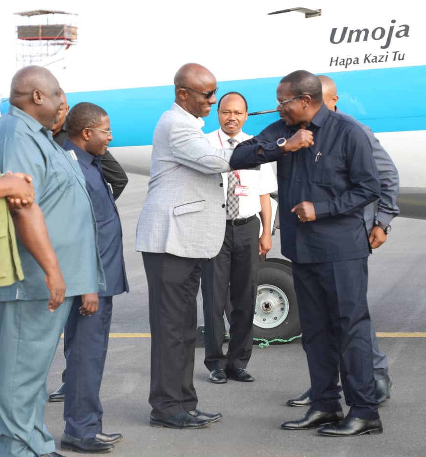 | Makamu wa Rais wa Jamhuri ya Muungano wa Tanzania Mhe. Dkt. Philip Isdor Mpango, akisalimiana na Mkuu wa Mkoa wa Geita Engineer Gabriel pamoja na Viongozi mbalimbali wa Serikali, wakati alipowasili katika Uwanja wa Ndege wa Chato Mkoani Geita leo Mei 14,2021 |