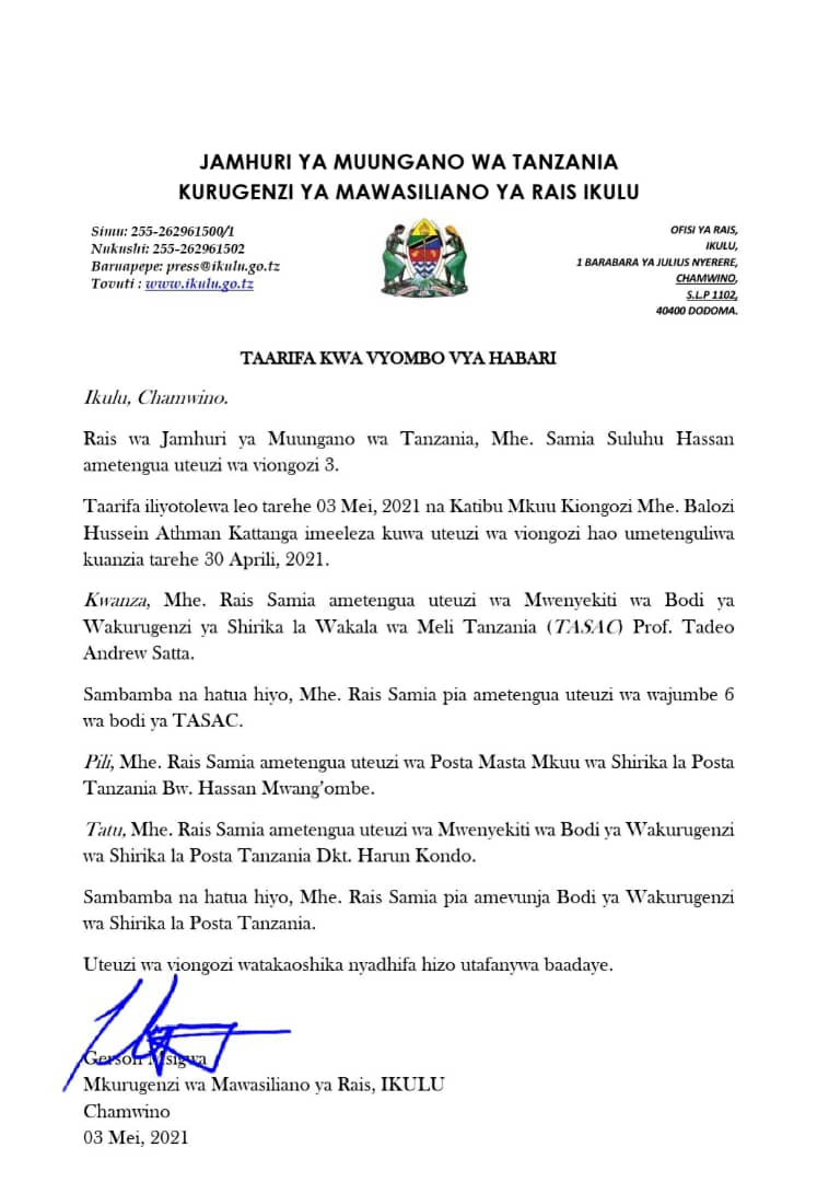 Home LOCAL MHE. RAIS SAMIA ATENGUA UTEUZI WA VIONGOZI WATATU . MHE. RAIS SAMIA ATENGUA UTEUZI WA VIONGOZI WATATU . By Joseph Nelson - May 3, 2021 FacebookTwitterTelegramWhatsAppCopy URL Thank you for reading this post, don't forget to subscribe!