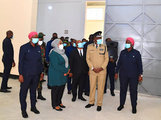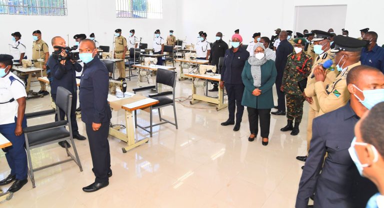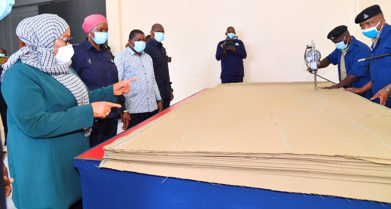 Rais wa Jamhuri ya Muungano wa Tanzania Mheshimiwa Samia Suluhu Hassan akikagua kazi mbalimbali zinazofanywa katika kiwanda hicho cha ushonaji cha Jeshi la Polisi Tanzania kilichopo Kurasini mkoani Dar es Salaam mara baada ya kukifungua leo tarehe 18 Mei, 2021.