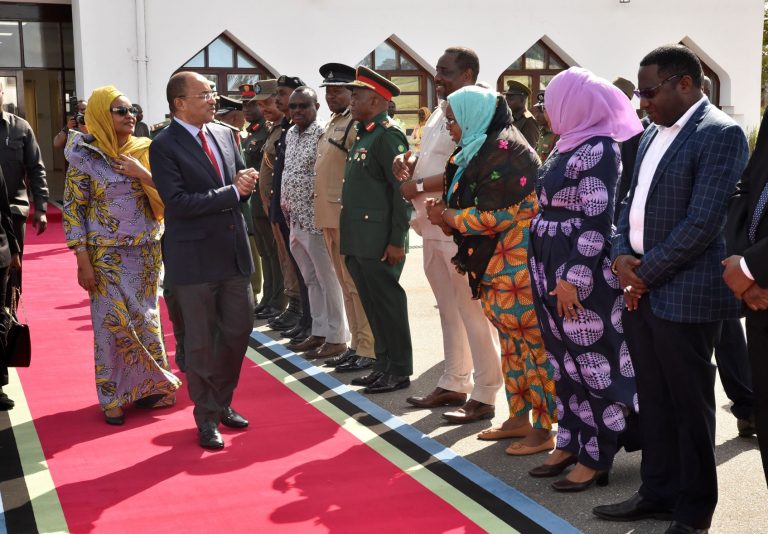 Mapinduzi Mhe.Dk.Hussein Ali Mwinyi na Mkewe Mama Mariam Mwinyi, wakisalimiana na Wakuu wa Vyombo vya Ulinzi na Usalama Zanzibar, katika Uwanja wa Ndege wa Kimataifa wa Abeid Amani Karume Zanzibar,wakati akielekea Nchini Msumbuji kuhudhuria Mkutano wa SADC unaotarajiwa kufanyika kesho Jijini Maputo.
