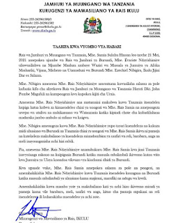 Rais wa Jamhuri ya Muungano wa Tanzania Mhe. Samia Suluhu Hassan akisoma Ujumbe katika barua iliyotoka kwa Rais wa Jamhuri ya Burundi Evariste Ndayishimiye uliowasilishwa kwake Mjumbe Maalum kutoka kwa Rais wa Jamhuri ya Burundi, Balozi Ezechiel Nibigira Waziri anayeshughulikia Masuala ya Afrika Mashariki, Vijana, Michezo na Utamaduni wa Burundi mara baada ya kuwasili Ikulu Jijini Dar es Salaam leo tarehe 21 Mei, 202i.