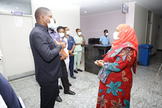 Naibu Waziri wa Afya, Maendeleo ya Jamii, Jinsia, Wazee na Watoto, anayeshughulikia Maendeleo ya Jamii, Mwanaidi Ali Khamis (wa pili kulia) akipata maelekezo ya idadi ya wazee wanaohudumiwa katika Hospitali ya Benjamin Mkapa kutoka kwa mmoja wa wahudumu alipofika hospitalini hapo kukagua namna agizo la kuboresha huduma za matibabu kwa wazee linavyotekelezwa wakati wa ziara yake jana. wa pili kulia mwenye Kaunda Suti nyeusi ni Mkurugenzi Mtendaji wa Hospitali hiyo, Dkt. Alphonce Chandika.
