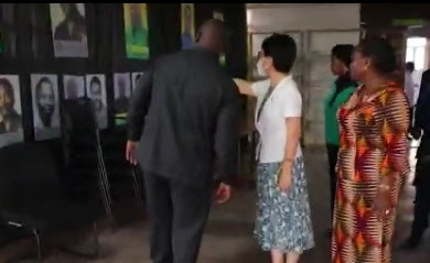 | Katibu Mkuu wa CCM Chongolo akimuonyesha Wang Ke picha za viongozi wastaafu wa CCM. Kulia ni Naibu Katibu Mkuu wa CCM Bara Christina Mndeme. |
