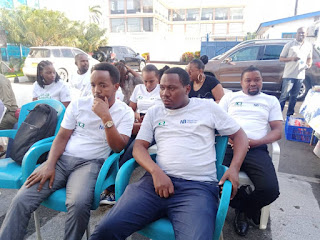 | Baadhi ya wafanyakazi wa benki ya ACB wakisubiri kupitia hatua mbalimbali kabla ya kuchangia damu kwenye kampeni hiyo leo. |