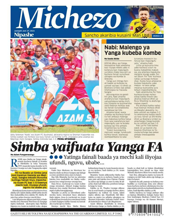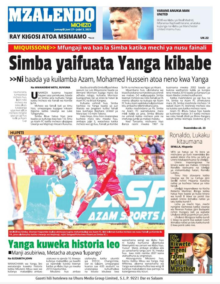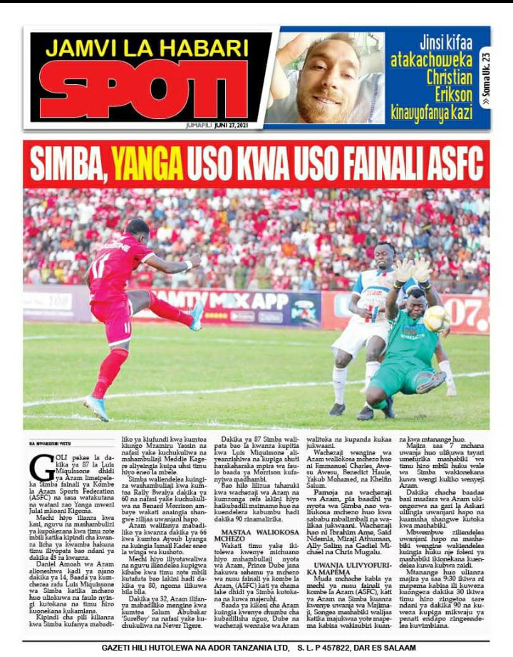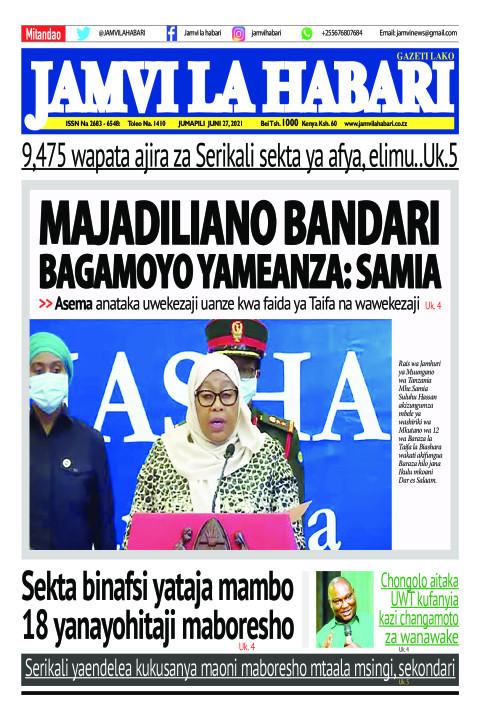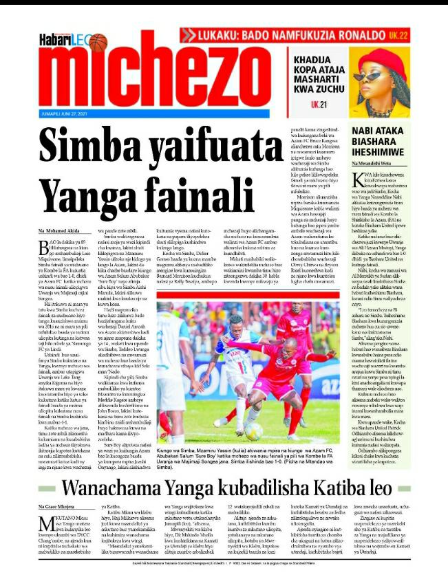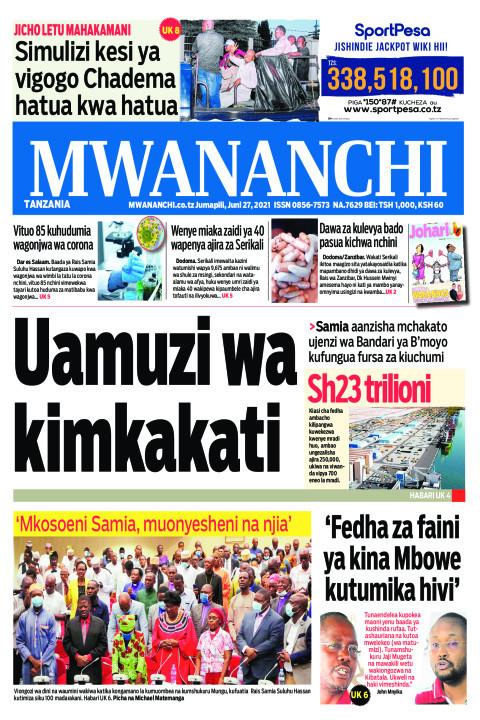 Home Uncategorized MAGAZETI YA LEO J.PILI JUNI 27-2021 MAGAZETI YA LEO J.PILI JUNI 27-2021 By Joseph Nelson - June 27, 2021 FacebookTwitterTelegramWhatsAppCopy URL Thank you for reading this post, don't forget to subscribe! Karibu msomaji wetu kwenye meza ya Magazeti ya leo uweze kujisomea habari kemkem za ndani na Nje ya Nchi yetu, Karibu sana.