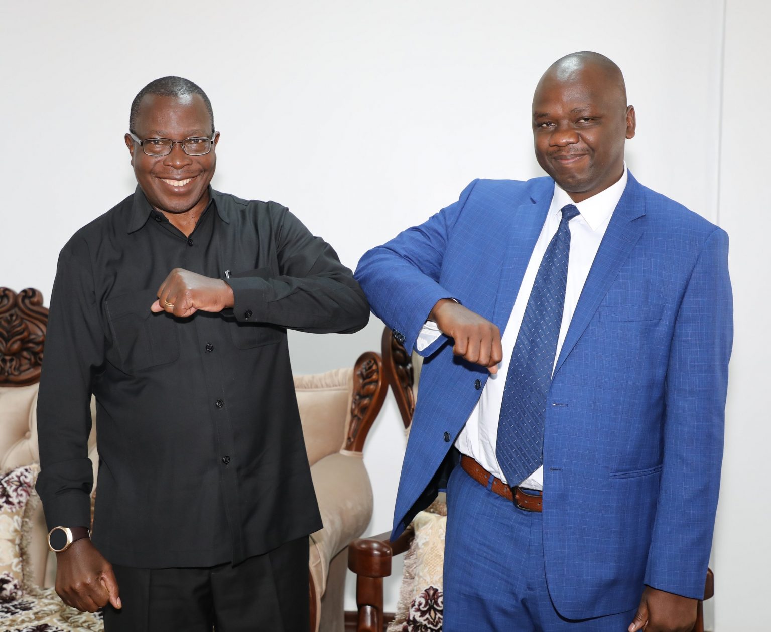 | Makamu wa Rais wa Jamhuri ya Muungano wa Tanzania Mhe. Dkt. Philip Isdor Mpango, akisalimiana na Naibu Katibu Mkuu Ofisi ya Makamu wa Rais Bw. Mohammed Khamis Abdalla wakati Bw. Abdalla alipofika Ofisini kwa Makamu wa Rais Ikulu Chamwino Jijini Dodoma leo Juni 01,2021. |
