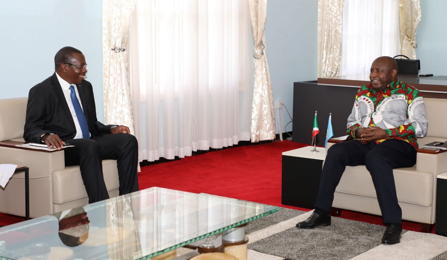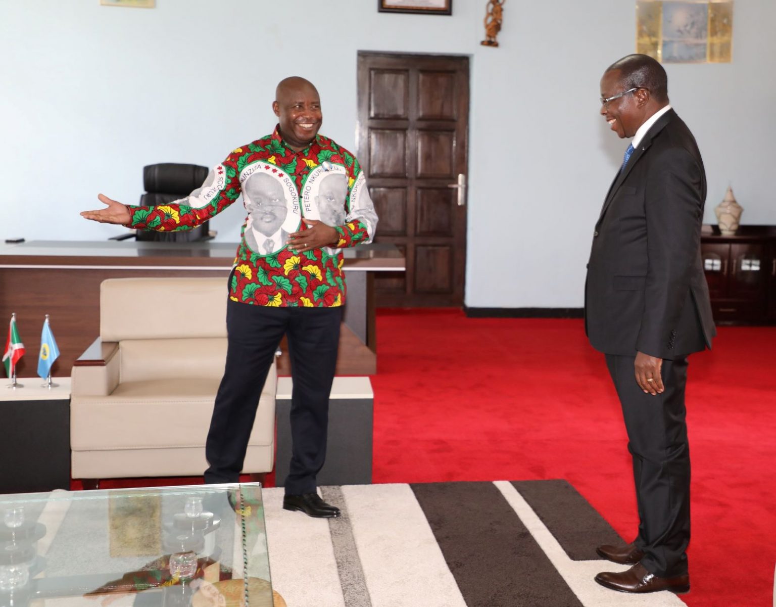| Rais wa Burundi Mhe. Evariste Ndayishimiye akimkaribisha Makamu wa Rais wa Jamhuri ya Muungano wa Tanzania Mhe. Dkt. Philip Isdori Mpango Ofisini kwake Ikulu Gitega Burundi kwa ajili ya Mazungumzo. Makamu wa Rais Mhe. Dkt. Philip Isdor Mpango amemuwakilisha Rais wa Jamhuri wa Tanzania Mhe. Samia Suluhu Hassan kwenye kumbukizi ya kutimiza Mwaka mmoja wa kifo cha aliyekuwa Rais wa Burundi Hayati Pierre Nkurunziza iliyofanyika jana katika Mji Mkuu wa Serikali Gitega Nchini Burundi. |