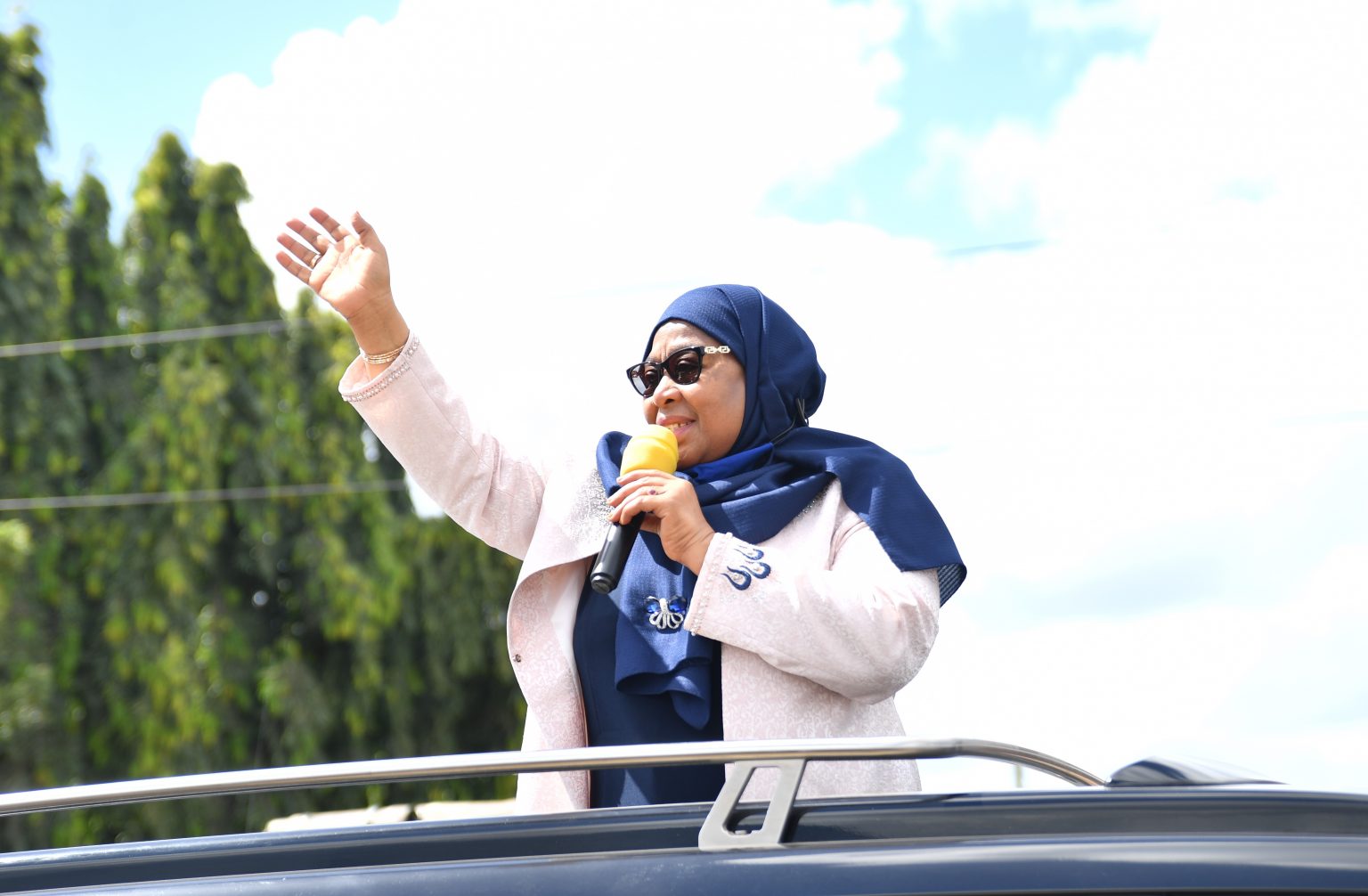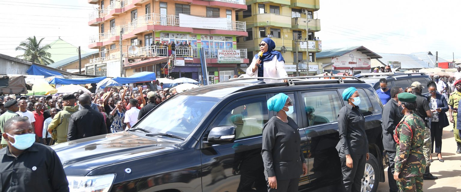 | Rais wa Jamhuri ya Muungano wa Tanzania Mheshimiwa Samia Suluhu Hassan akizungumza na wananchi wa Kwa Azizi Ali mara baada ya kufanya ziara ya kushtukiza kukagua mradi wa ujenzi wa Barabara ya Mabasi ya Mwendokasi katika barabara ya Kilwa. |