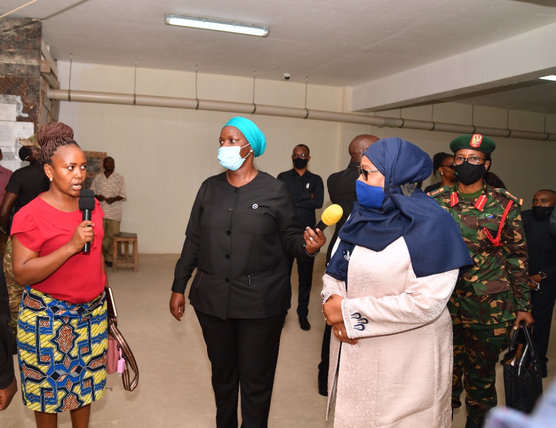 | Rais wa Jamhuri ya Muungano wa Tanzania Mhe. Samia Suluhu Hassan akipewa maelezo kuhusu mradi wa Soko la Kisutu mara baada ya kufanya ziara ya kushtukiza Sokoni hapo. PICHA NA IKULU |