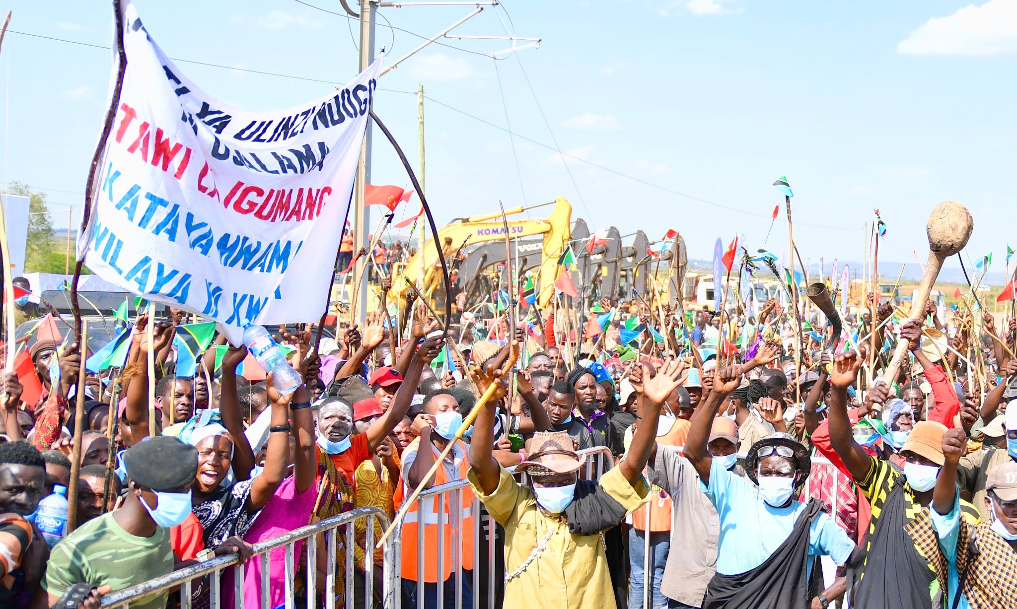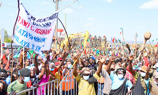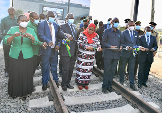 Rais wa Jamhuri ya Muungano wa Tanzania, Mhe. Samia Suluhu Hassan akivuta utepe kuweka jiwe la Msingi Ujenzi wa Reli ya Kisasa Standard Gauge Railway (SGR) kutoka Mwanza hadi Isaka mkoani Shinyanga katika sherehe zilizofanyika Fela mkoani Mwanza leo tarehe 14 Juni, 2021. Kushoto ni Naibu Katibu Mkuu wa CCM Bara Christina Mndeme.
