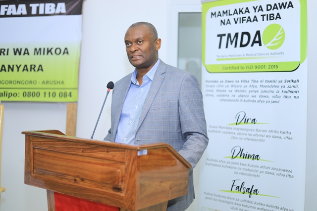 Mkurugenzi Mkuu wa Mamlaka ya Dawa na Vifaa Tiba (TMDA) Bw. Adam Fimbo akizungumza kwenye ufunguzi wa Kikao Kazi cha Wahariri wa Vyombo vya habari na waandishi wa habari wa mikoa ya Kilimanjaro,Manyara na Arusha kinachofanyika kwenye ukumbi wa Mamlaka ya Hifadhi ya Ngorongoro (NCAA) jijini Arusha leo Jumatano Juni 2,2021.