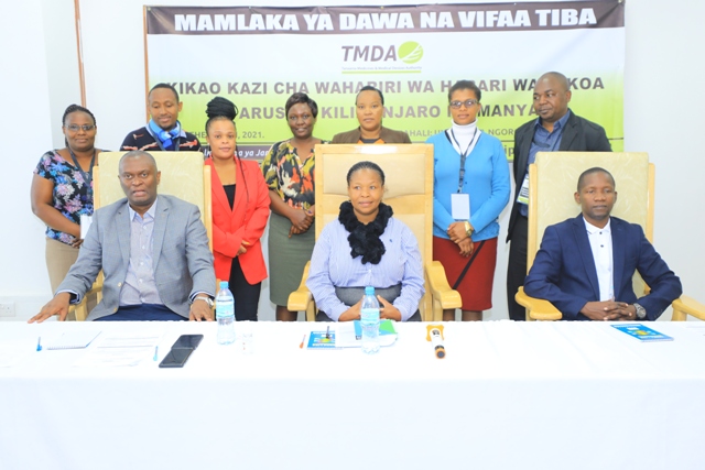 Mkurugenzi Mkuu wa Mamlaka ya Dawa na Vifaa Tiba (TMDA) Bw. Adam Fimbo akizungumza jambo na mgeni rasmi Vones Uiso Kaimu Mganga Mkuu wa Mkoa wa Arusha katikati ni Gaudensia Simwanza, Meneja mawasiliano na elimu kwa umma kutoka mamlaka ya dawa na vifaa tiba (TMDA).
