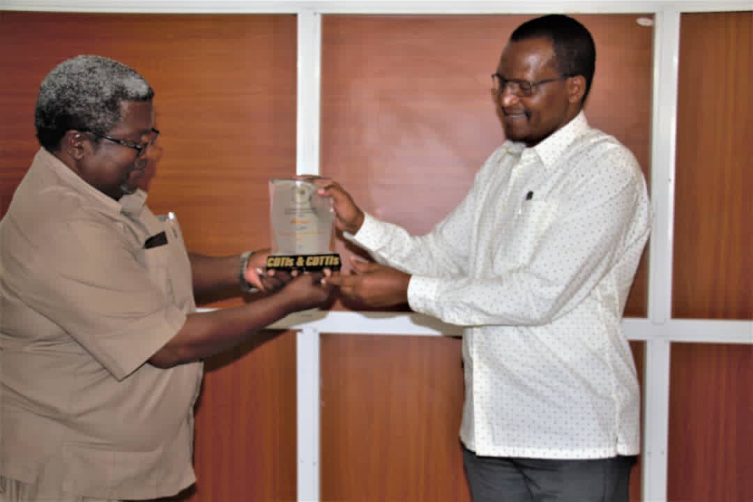 Katibu Mkuu Wizara ya Afya-Idara Kuu ya Maendeleo ya Jamii Dkt. John Jingu akipokea ngao ya ushindi wa Vyuo vya Maendeleo ya Jamii katika maonesho ya pili ya Elimu na mafunzo ya ufundi kutoka kwa Mkuu wa Chuo cha Maendeleo ya Jamii Uyole Sadick Rajab katika Ofisi za Wizara, Jijini Dodoma.