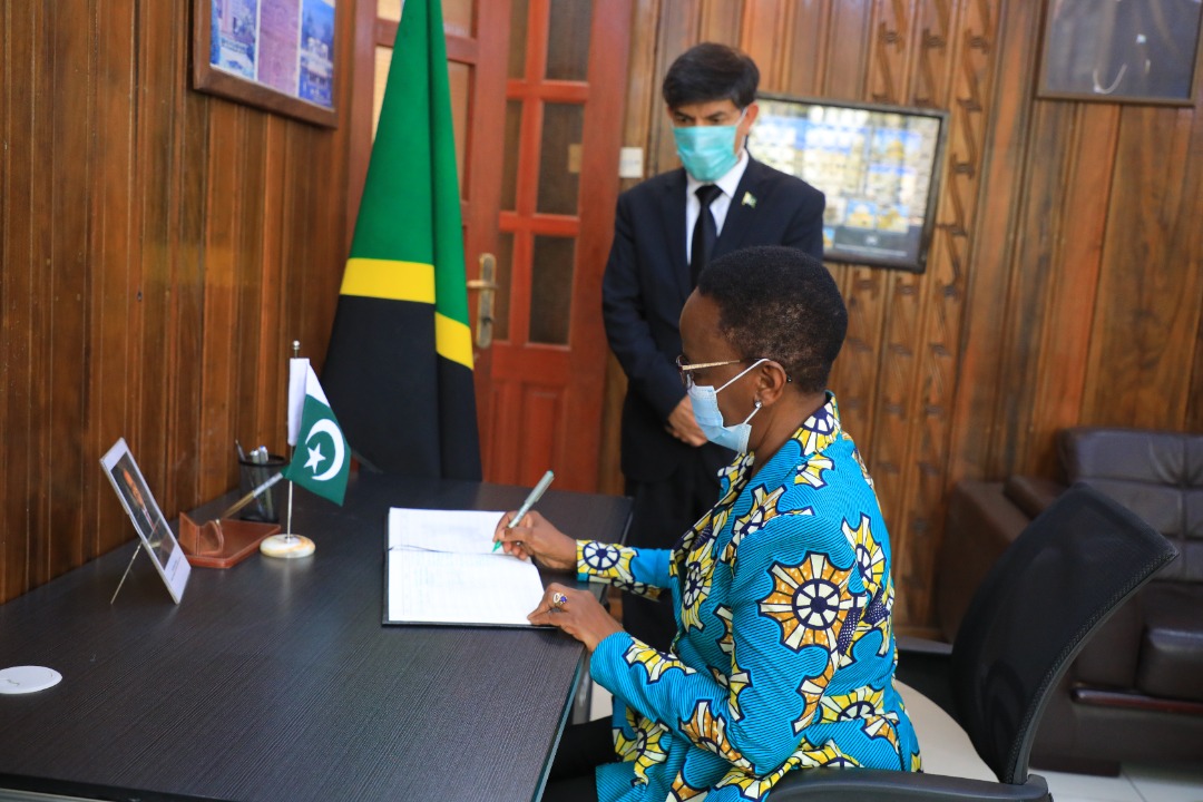 Waziri wa Mambo ya Nje na Ushirikiano wa Afrika Mashariki, Balozi Liberata Mulamula (Mb) akisaini kitabu cha maombolezo leo Tarehe 19.07.2021 Ubalozi wa Pakistan hapa nchini kufuatia kifo cha Rais mstaafu wa Pakistan Hayati Mamnoon Hussain aliyefariki Julai 14, 2021.