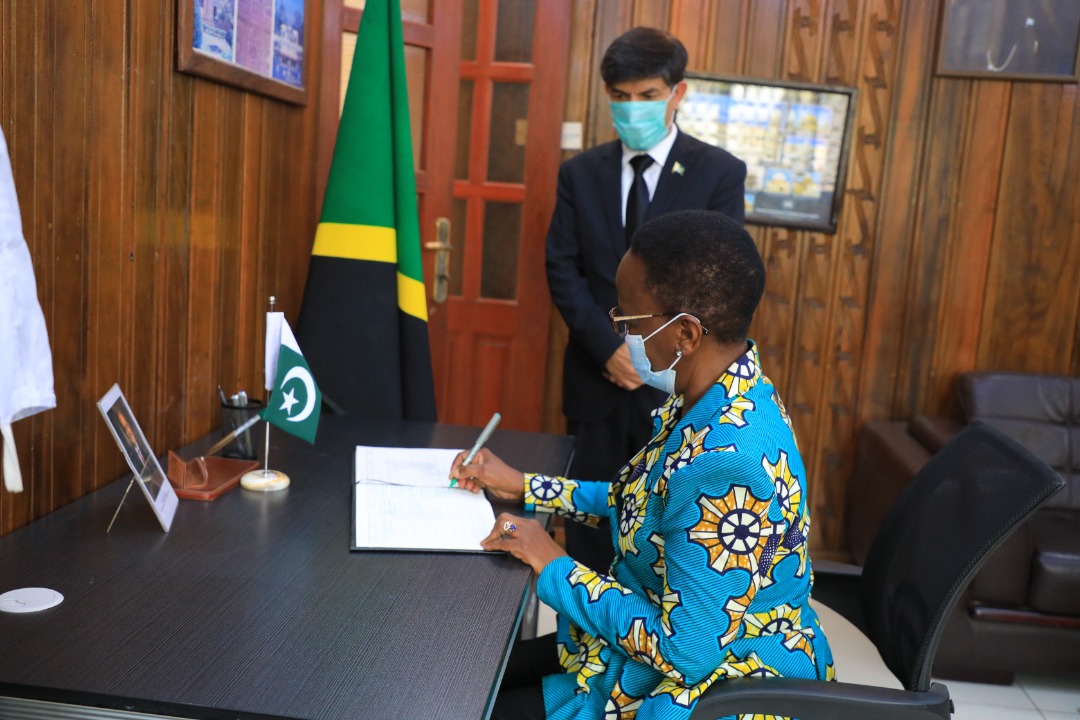 Waziri wa Mambo ya Nje na Ushirikiano wa Afrika Mashariki, Balozi Liberata Mulamula (Mb) akisaini kitabu cha maombolezo leo Tarehe 19.07.2021 Ubalozi wa Pakistan hapa nchini kufuatia kifo cha Rais mstaafu wa Pakistan Hayati Mamnoon Hussain aliyefariki Julai 14, 2021.