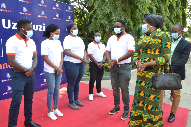 Mkuu wa Mkoa wa Tabora, Balozi Dk. Batilda Burian (kulia), akitambulishwa kwa baadhi ya wafanyakazi wa Kampuni ya Mbolea ya Yara na Bwanashamba Mauzo Kanda ya Ziwa na Magharibi wa kampuni hiyo, Khaji Halidi (kulia kwake), alipokwenda kuzindua program ya yaraConnect kwa Mkoa wa Dodoma jana. Programu hiyo inayopatikana katika simu janja kupitia ‘play store na app store’ inalenga katika kutoa elimu ya utaalamu wa masuala ya kilimo.