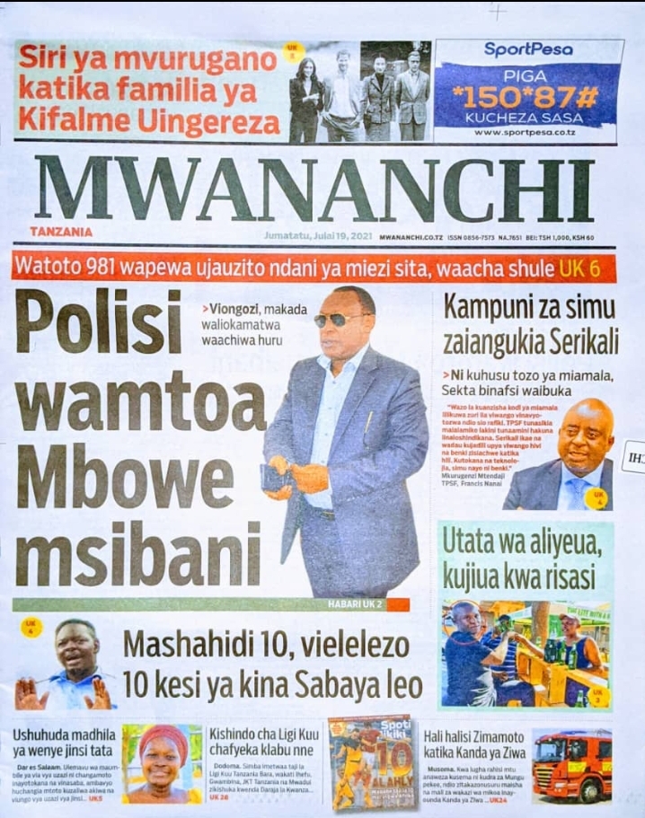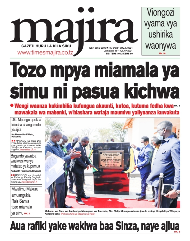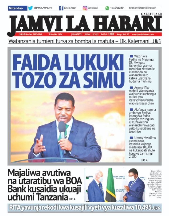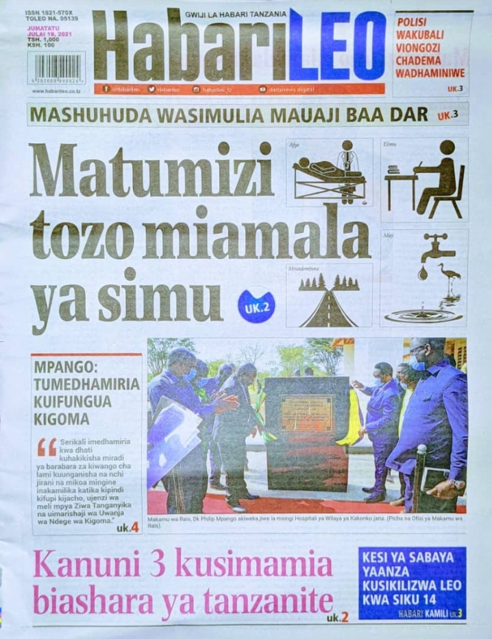 Home Uncategorized HABARI KUU ZILIZOPO MAGAZETI YA LEO J.TATU JULAI 19-2021 HABARI KUU ZILIZOPO MAGAZETI YA LEO J.TATU JULAI 19-2021 By Joseph Nelson - July 19, 2021 FacebookTwitterTelegramWhatsAppCopy URL Thank you for reading this post, don't forget to subscribe!
