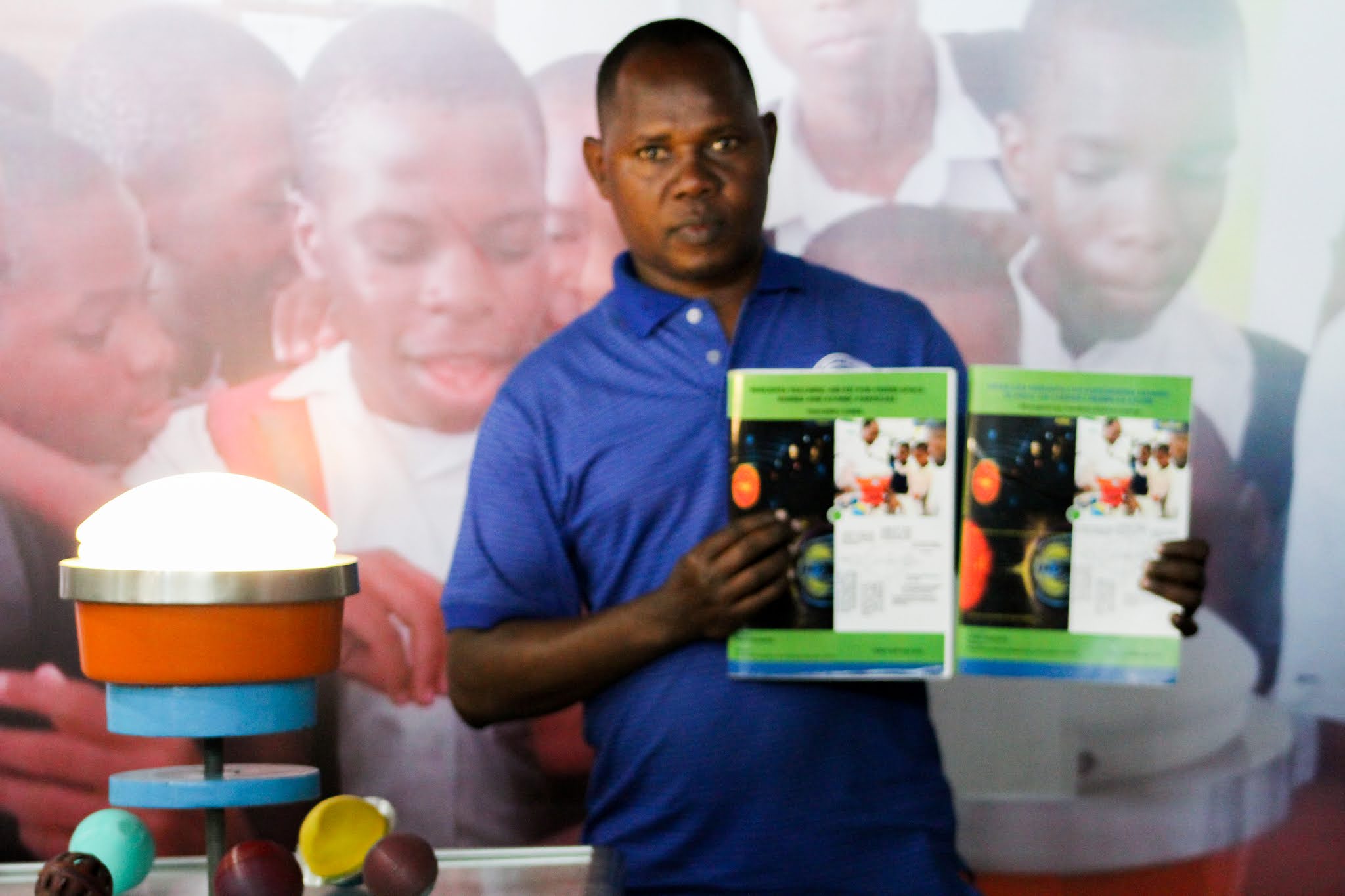 | Mvumbuzi wa kifaa malum cha mfumo wa jua na Elimu na Sayansi ya Anga Ernest Malanya akionesha kitabu alichokiandaa Kwaajili ya kufundishia. |