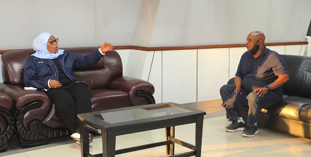 Rais wa Jamhuri ya Muungano wa Tanzania Mhe. Samia Suluhu Hassan, akizungumza na Rais wa Shirikisho la Mpira wa Miguu TFF Wallace Karia, alipowasili katika Uwanja wa Benjamin Mkapa leo Julai 03,2021 kwa ajili kuangalia Mpambano kati ya Watani wa Jadi Simba na Yanga.