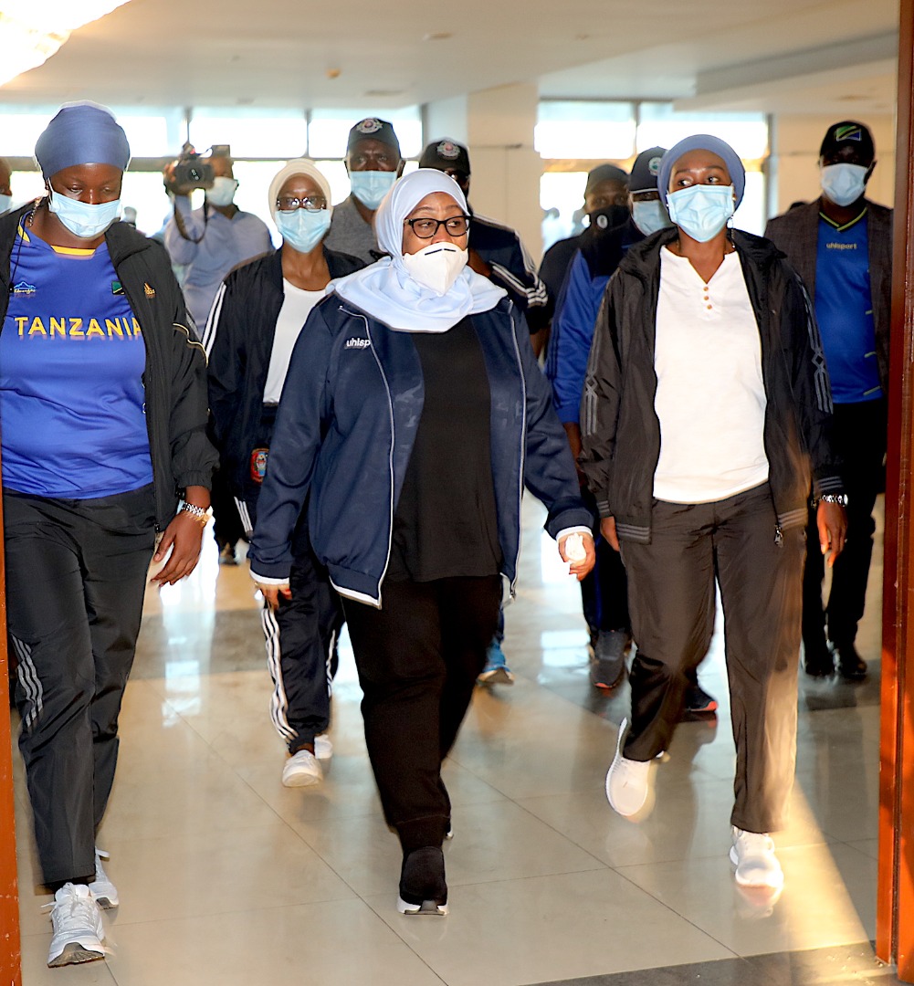 Rais wa Jamhuri ya Muungano wa Tanzania Mhe. Samia Suluhu Hassan, akiingia Uwasili katika Uwanja wa Benjamin Mkapa leo Julai 03,2021 kwa ajili kuangalia Mpambano kati ya Watani wa Jadi Simba na Yanga.