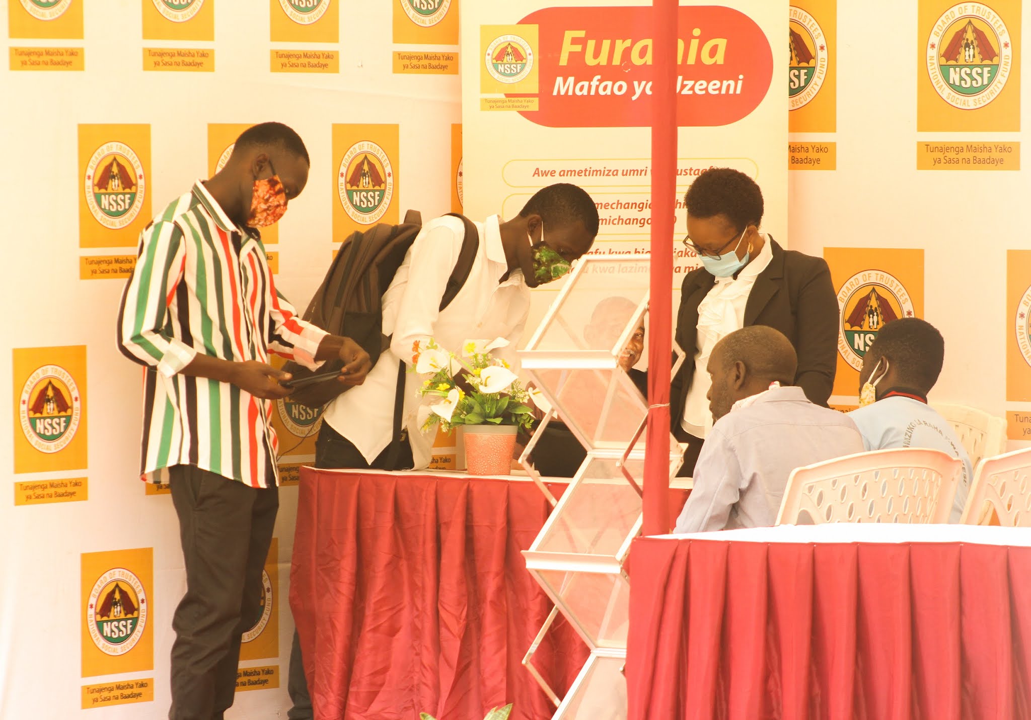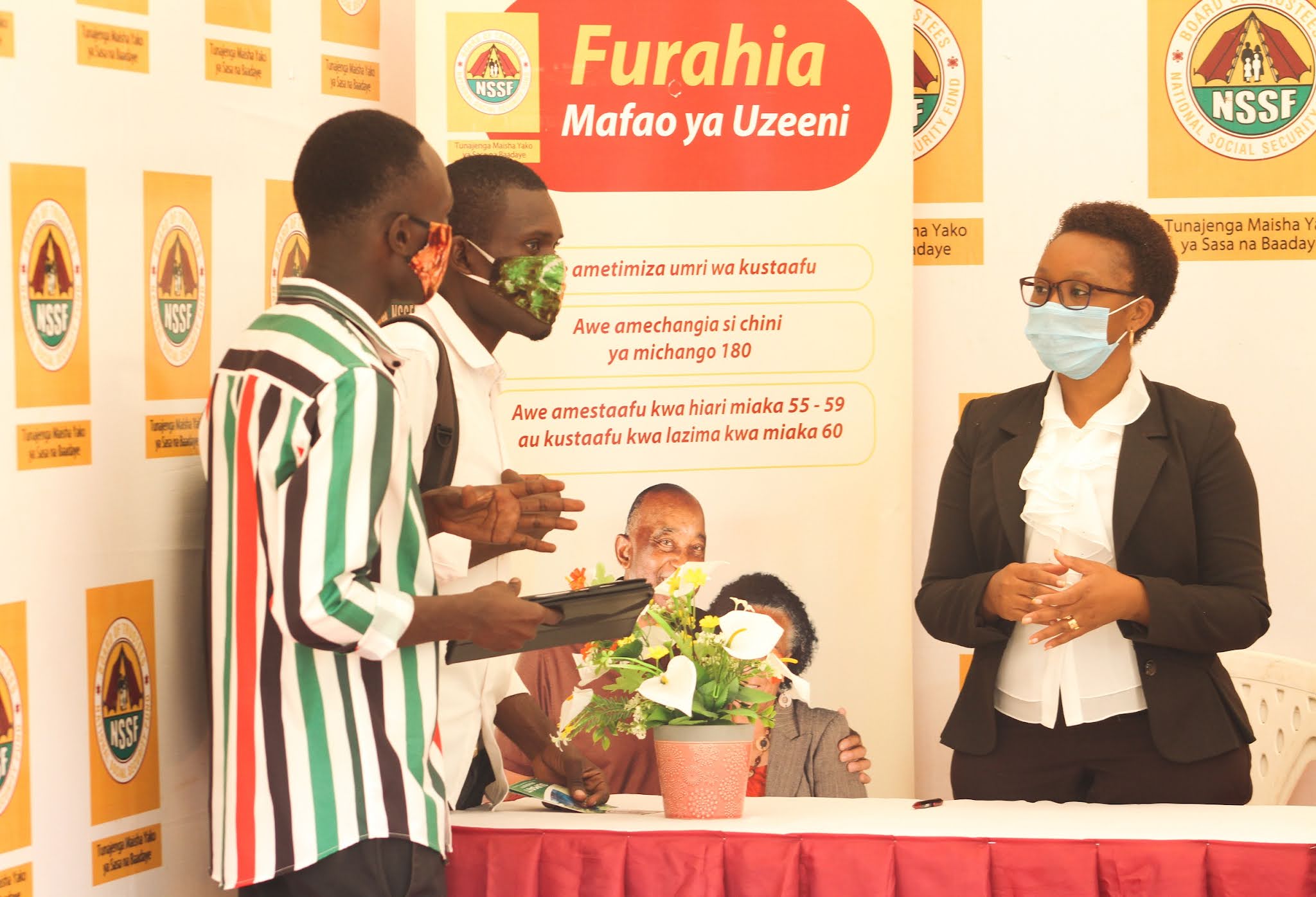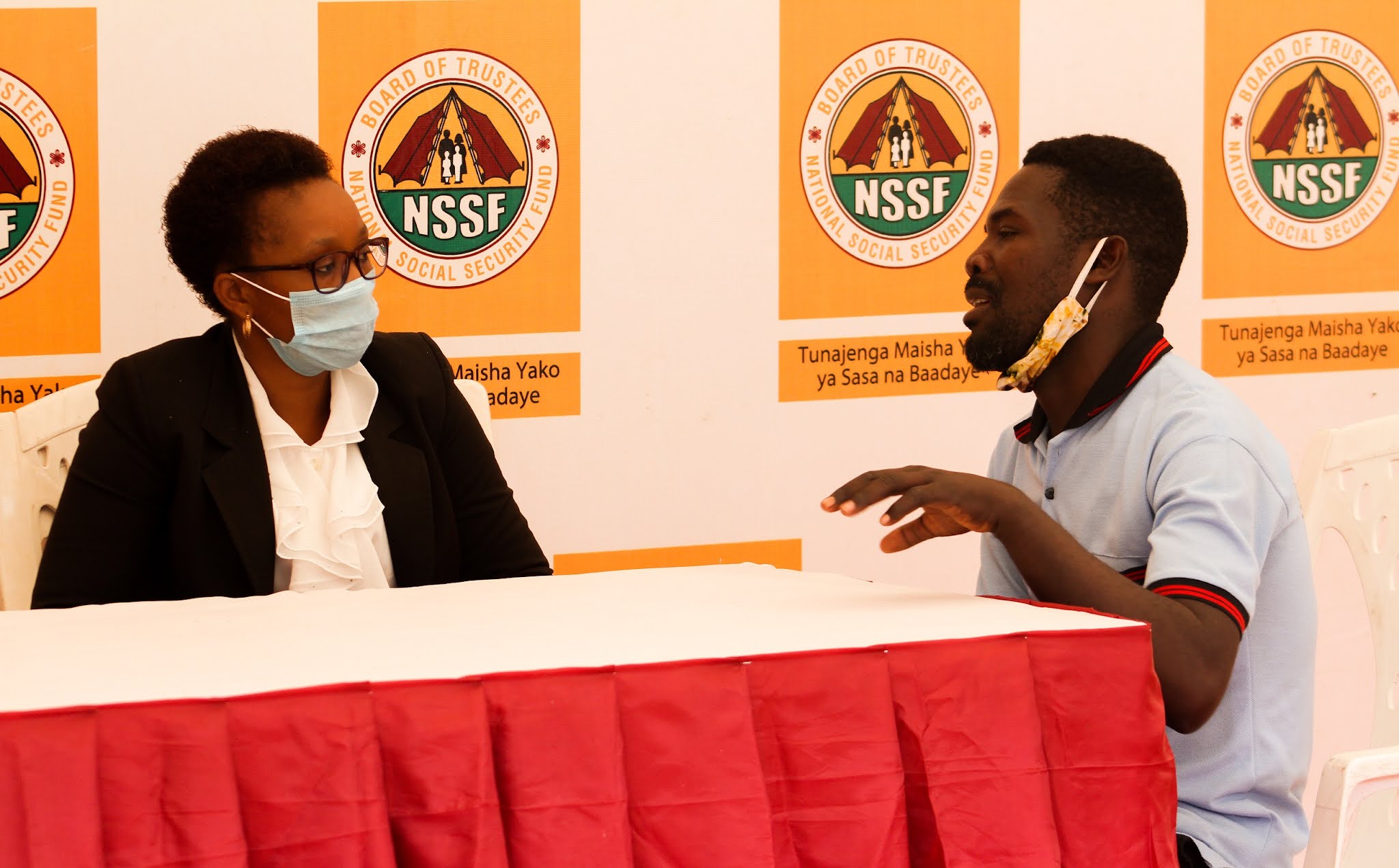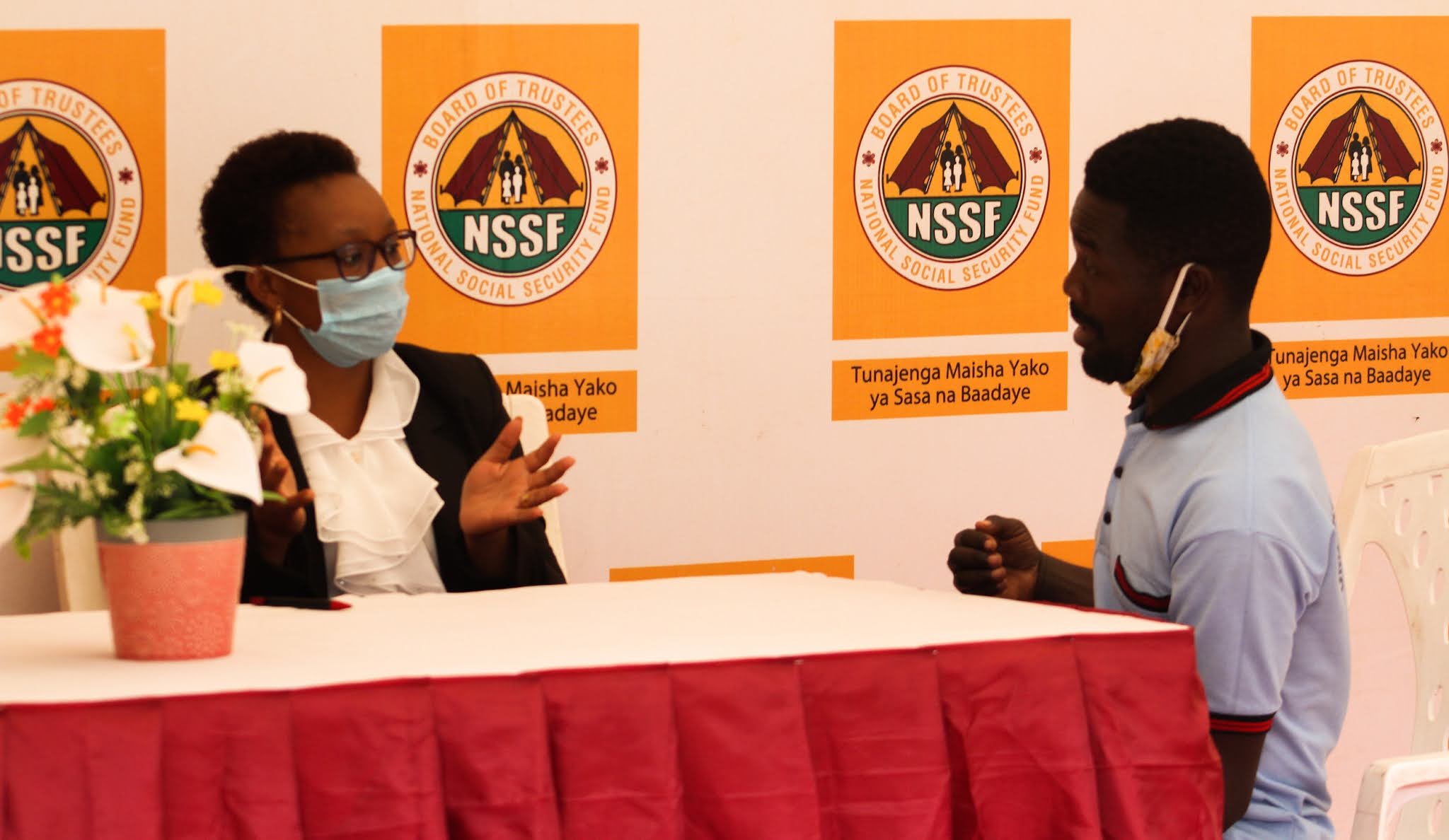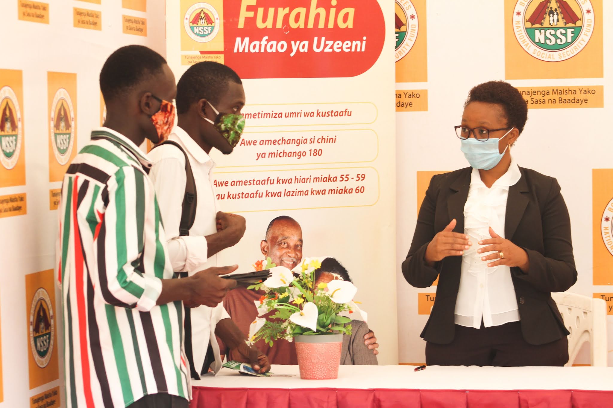 Afisa Mwandamizi Uhusiano wa NSSF Rachel Hosea (kulia) akimsikiliza kijana Edwin Mitumba (wa pili kushoto) alipokuwa akimuuliza maswali Afisa huyo juu ya mambo mbalimbali za Mfuko huo.