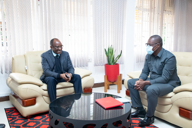 Naibu Waziri wa Mawasiliano na Teknolojia ya Habari Mhandisi Kundo Mathew (kulia) akizungumza na Mkuu wa Mkoa wa Kilimjanjaro Mhe. Stephen Kigaigai ofisini kwake Mkoani Kilimanjaro kabla ya kuanza ziara yake ya kukagua ubora na upatikanaji wa huduma ya mawasiliano ya simu