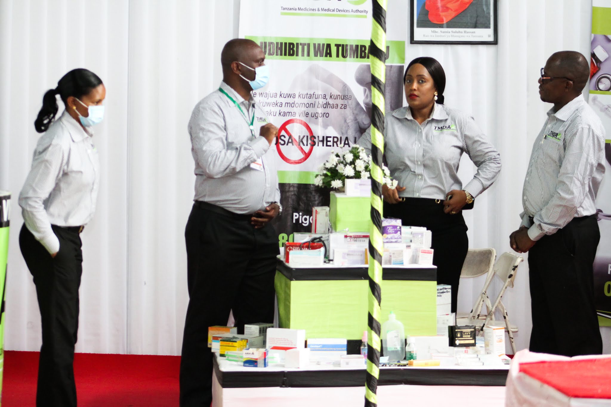 Mkurugenzi Mkuu wa Mamlaka ya Dawa na Vifaa Tiba (TMDA) Adam Fimbo (kushoto) akizungumza na Meneja Mawasiliano na Uhusiano wa Umma wa TFDA Bi. Gaudensia Simwanza (kulia) alipokuwa kwenye Banda la Taasisi hiyo kwenye maonesho ya Biashara ya 45 ya Kimataifa (Sabasaba) yaliyofunguliwa rasmi Julai 5,2021 na Makamu wa Rais Dkt. Philip Mpango.