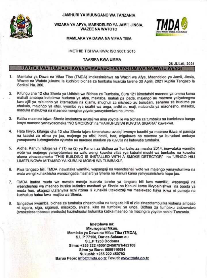 Home LOCAL TMDA YATOA MAELEKEZO UVUTAJI SIGARA MAENEO YA UMMA. TMDA YATOA MAELEKEZO UVUTAJI SIGARA MAENEO YA UMMA. By Joseph Nelson - July 26, 2021 FacebookTwitterTelegramWhatsAppCopy URL Thank you for reading this post, don't forget to subscribe!