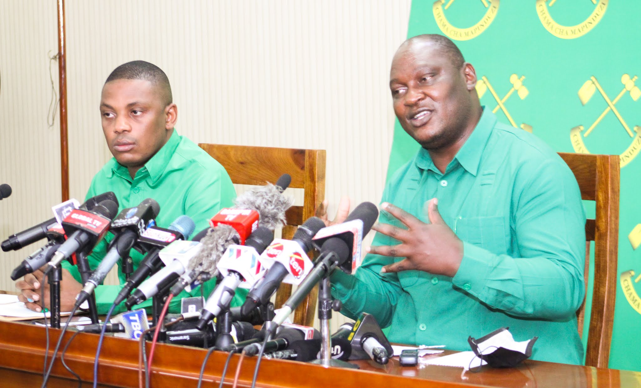 Katibu Mkuu wa CCM Daniel Chongolo (kulia) akizungumza wakati wa Mkutano huo na kutangaza kusimamishwa kuchapishwa kwa Gazeti la Uhuru lilipo chini ya Chama hicho. (kushoto) ni Katiku wa Itikadi na Uenezi Sahaka hamdu Shaka.