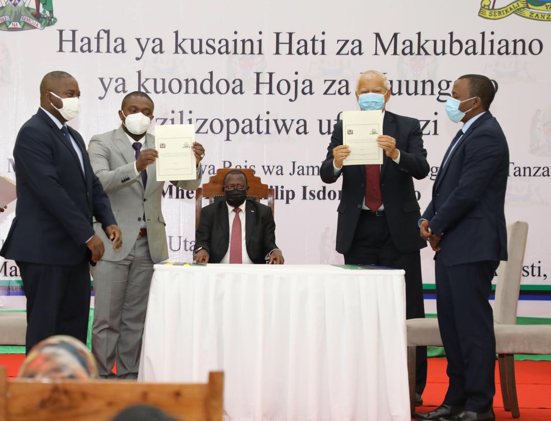 Makamu wa Rais wa Jamhuri ya Muungano wa Tanzania Dkt. Philip Isdor Mpango akishuhudia utiaji saini wa hati za makubaliano ya kuondoa hoja za Muungano zilizopatiwa ufumbuzi. Hafla iliofanyika katika Ukumbi wa Chuo cha Utalii,Maruhubi, Zanzibar Agosti 24,2021.