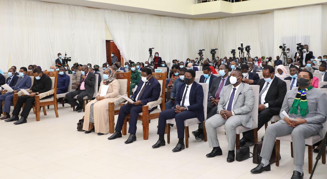 Viongozi mbalimbali wakiwemo Mawaziri na Makatibu wakuu kutoka pande zote za Muungano wakifuatilia utiaji saini wa hati za makubaliano ya kuondoa hoja za Muungano zilizopatiwa ufumbuzi. Hafla iliofanyika katika Ukumbi wa Chuo cha Utalii,Maruhubi, Zanzibar Agosti 24,2021.