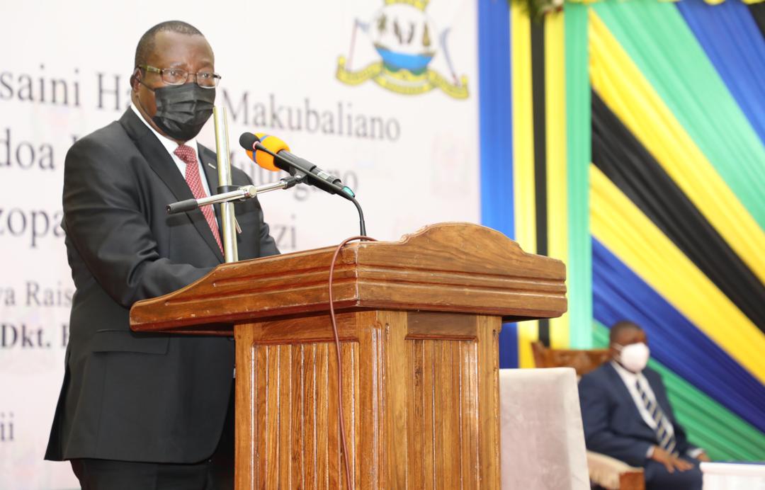 Makamu wa Rais wa Jamhuri ya Muungano wa Tanzania Dkt. Philip Isdor Mpango akizungumza na Viongozi mbalimbali walioshiriki katika kutafuta ufumbuzi hoja 11 za Muungano wakati wa Utiaji saini wa hati za makubaliano ya kuondoa hoja za Muungano zilizopatiwa ufumbuzi. Hafla iliofanyika katika Ukumbi wa Chuo cha Utalii,Maruhubi, Zanzibar Agosti 24,2021.