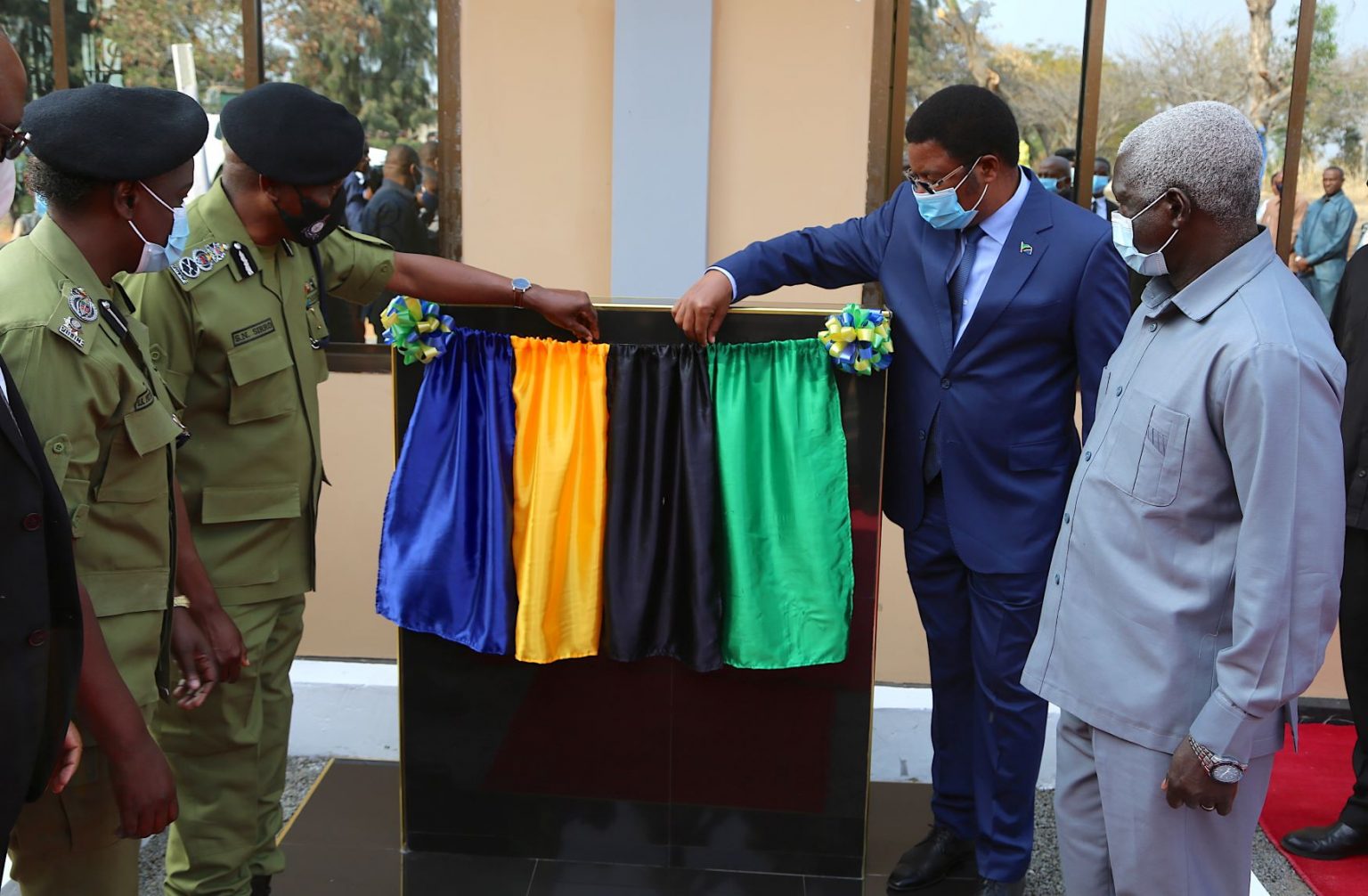 Waziri Mkuu, Kassim Majaliwa akifungua jengo la Makao Makuu ya Polisi Mkoa wa Singida Agosti 29, 2021. Kutoka kushoto ni Kamanda wa Polisi Mkoa wa Singida ACP Stella Mutabihirwa, Inspekta Jenerali wa Polisi Simon Sirro, na kulia ni Mkuu wa Mkoa wa Dodoma Dkt. Binilith Mahenge