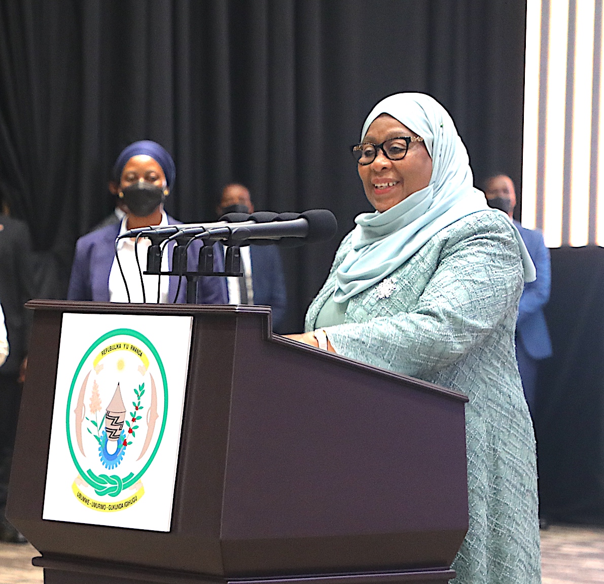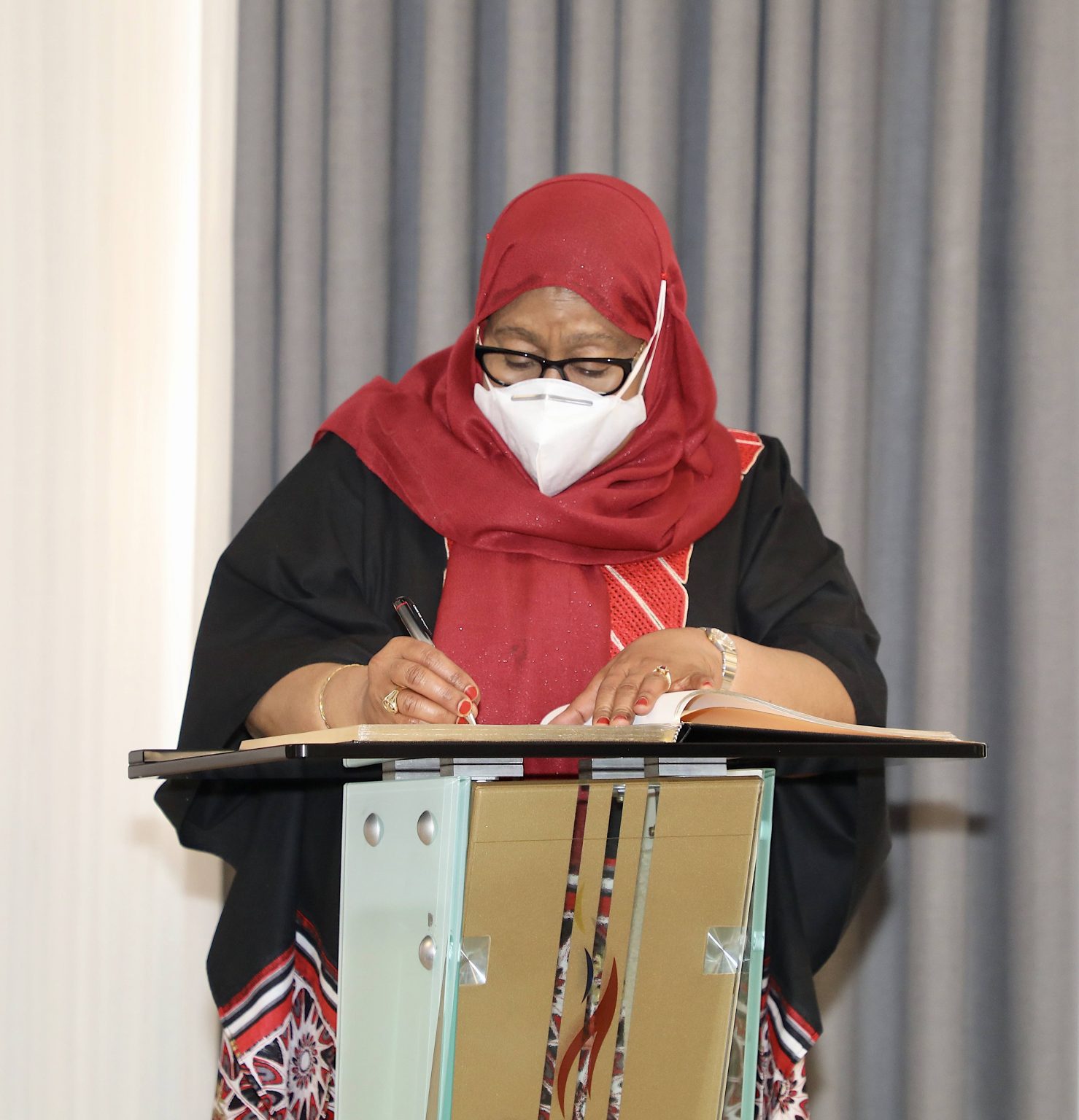 Rais wa Jamhuri ya Muungano wa Tanzania Mhe. Samia Suluhu Hassan, akitia saini kitambu cha kumbukumbu alipotembelea Makumbusho ya Hifadhi ya Kimbari Kigali Nchini Rwanda leo Agosti 02,2021.