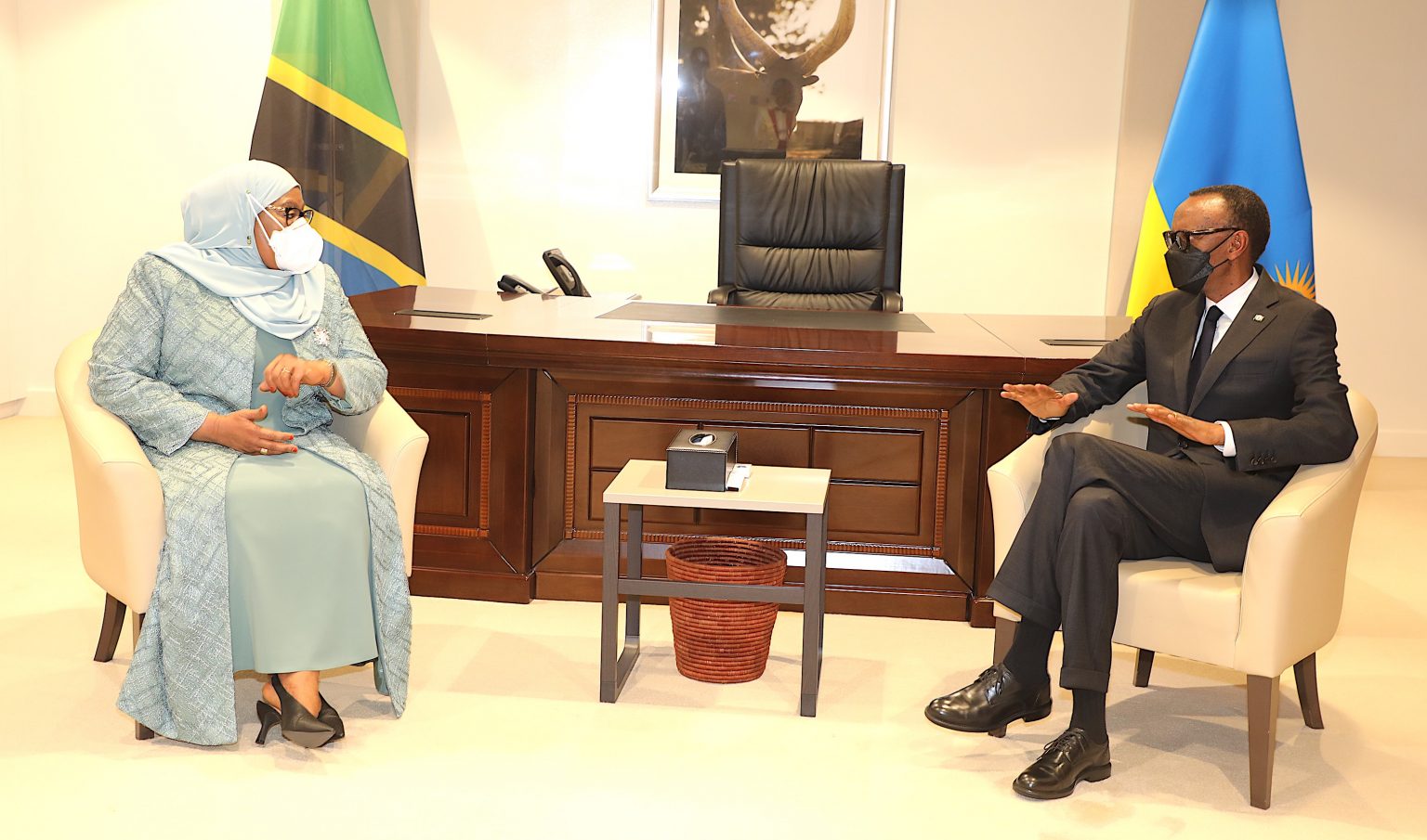 Rais wa Jamhuri ya Muungano wa Tanzania Mhe. Samia Suluhu Hassan, akizungumza na Rais wa Rwanda Mhe. Paul Kagame, wakati wa Chakula cha Jioni kilichoandaliwa na Rais Kagame Mjini Kigali Rwanda kwa ajili yake leo Agosti 02,2021. Mhe. Rais Samia yupo Nchini Rwanda kwa ziara ya Kiserikali ya siku mbili. IKULU.