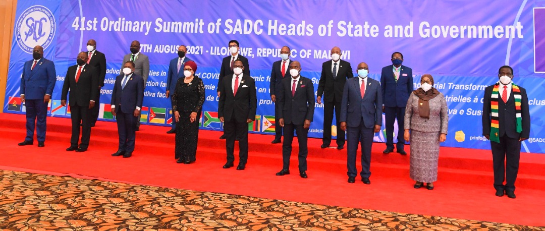 Rais wa Jamhuri ya Muungano wa Tanzania Mheshimiwa Samia Suluhu Hassan wapili kutoka (kulia) mstari wa mbele akiwa amesimama pamoja na Wakuu wa Nchi na Serikali wa Jumuiya ya Maendeleo Kusini mwa Afrika (SADC) mara baada ya ufunguzi wa Mkutano wa 41 SADC ulioanza leo tarehe 17 Agosti katika ukumbi wa Mikutano wa Kimataifa wa Bingu uliopo Jijini Lilongwe nchini Malawi.