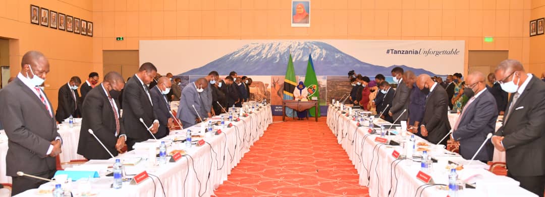 Rais wa Jamhuri ya Muungano wa Tanzania Mhe. Samia Suluhu Hassan, akiwaongoza Mawaziri kusimama kwa dakika moja kwa ajili ya kumkumbuka aliyekuwa Waziri wa Ulinzi na Jeshi la Kujenga Taifa Hayati Elias John Kwandikwa kabla ya kuanza kwa Kikao cha Baraza la Mawaziri kilichokutana leo Agosti 07,2021 Ikulu Jijini Dar es salaam. IKULU.