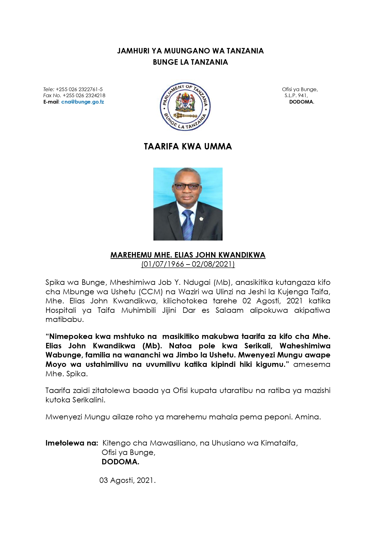 Home LOCAL SPIKA NDUGAI AMLILIA ELIAS KWANDIKWA SPIKA NDUGAI AMLILIA ELIAS KWANDIKWA By Joseph Nelson - August 3, 2021 FacebookTwitterTelegramWhatsAppCopy URL Thank you for reading this post, don't forget to subscribe!