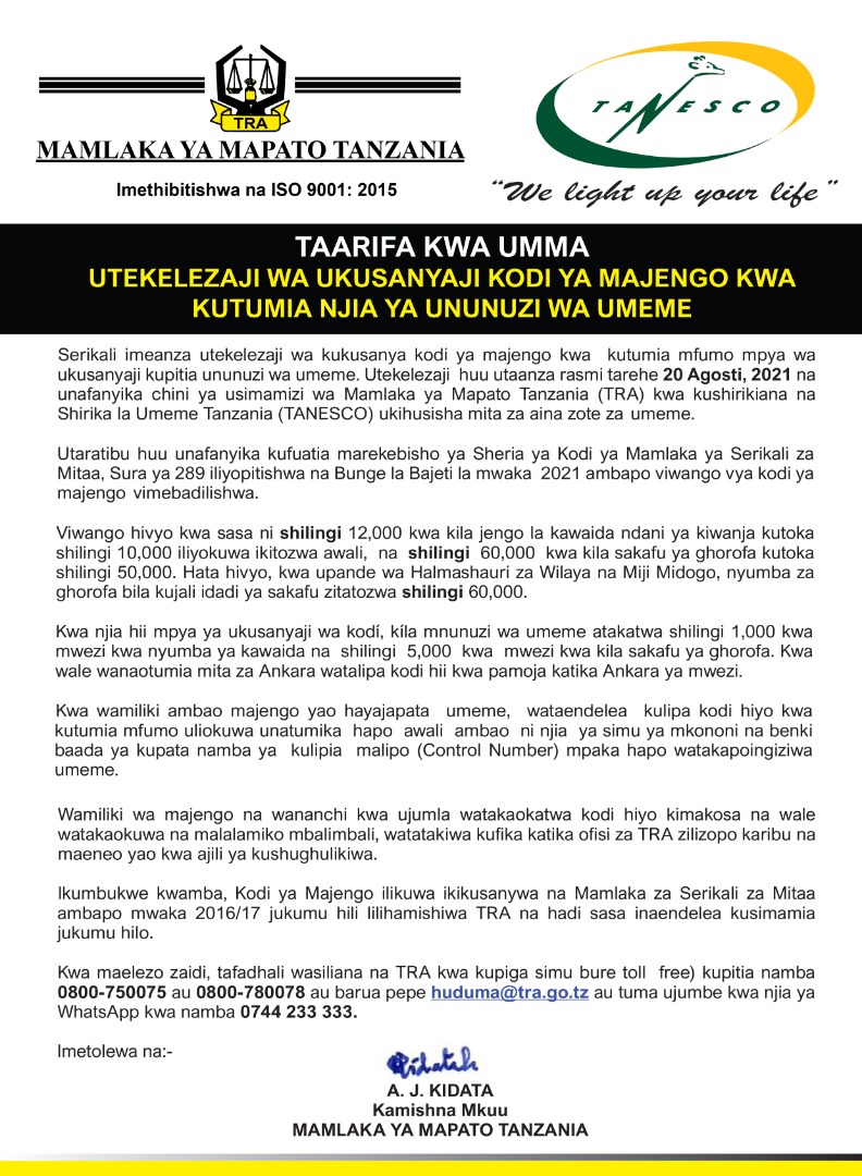 Home LOCAL TRA YATOA TAARIFA YA UTEKELEZAJI UKUSANYAJI KODI YA MAJENGO KWA NJIA YA... TRA YATOA TAARIFA YA UTEKELEZAJI UKUSANYAJI KODI YA MAJENGO KWA NJIA YA UNUNUZI WA UMEME By Joseph Nelson - August 19, 2021 FacebookTwitterTelegramWhatsAppCopy URL Thank you for reading this post, don't forget to subscribe!