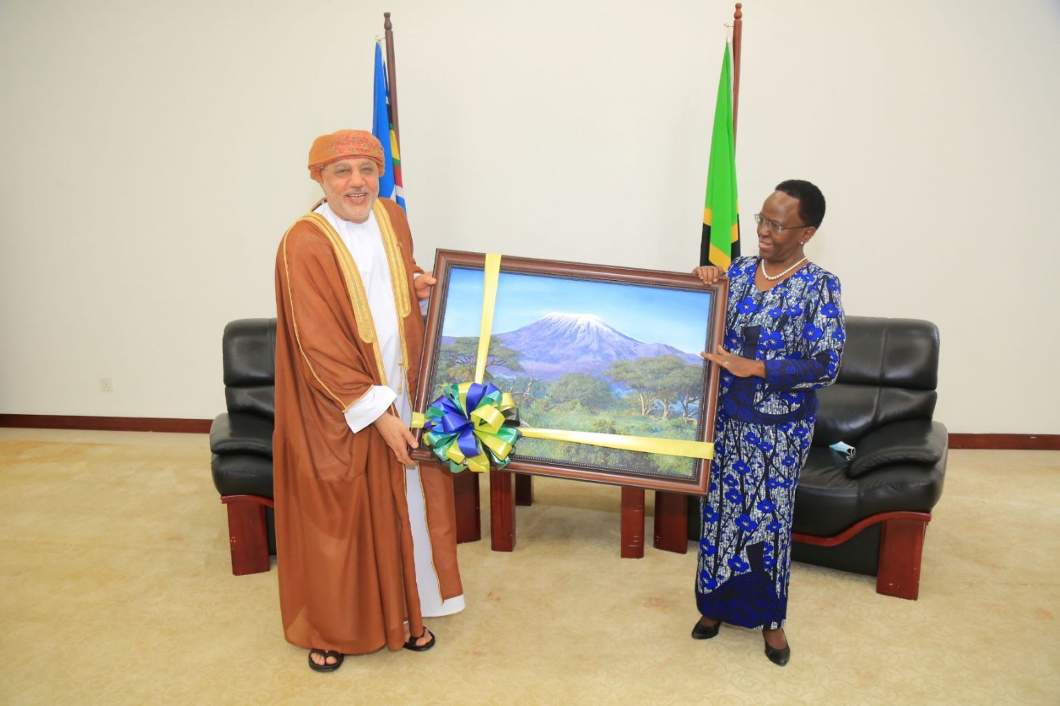 Waziri wa Mambo ya Nje na Ushirikiano wa Afrika Mashariki, Balozi Liberata Mulamula akimkabidhi zawadi ya picha ya Mlima Kilimanjaro Balozi wa Oman aliyemaliza muda wake wa uwakilishi nchini, Mhe. Ally Abdallah Almahruqi .
