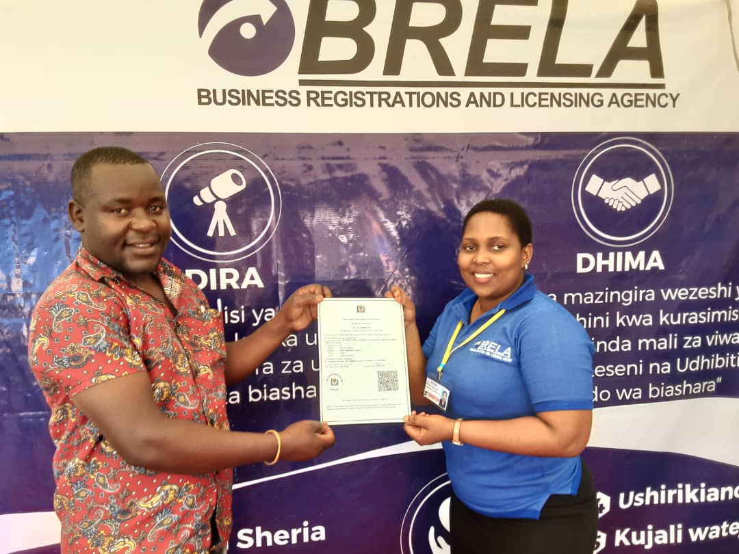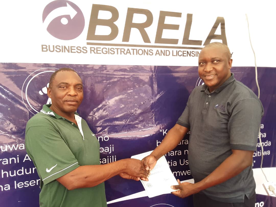 Ofisa Leseni wa Wakala wa Usajili wa Biashara na Leseni (BRELA), Bi. Winifrida Gaudence akimkabidhi cheti cha Leseni ya Biashara kundi A Bw. Gilinde Kapula Fale, mara baada ya usajili wa papo kwa papo katika banda la taasisi hiyo kwenye Maonesho ya Biashara ya 16 yanayoendelea katika viwanja vya Rock City Mall jijini Mwanza. Maonesho hayo yaliyoanza Agosti 28, 2021 na yanatarajiwa kuhitimishwa Septemba 5, 2021. (PICHA NA: BRELA)