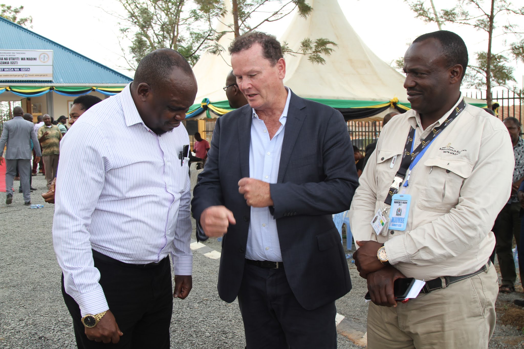 Mkurugenzi Mtendaji wa GGML Richard Jordinson (katikati) akizungumza na Kaimu Mkurugenzi Mtendaji wa STAMICO Dkt. Venance Mwasse (kushoto) pamoja na Meneja wa masuala ya kijamii Joseph Mangilima (kulia) wakati wa uzinduzi wa Ofisi za GST Mkoa wa Geita, muda mfupi kabla ya kuanza kwa ziara ya Waziri wa Madini Dotto Bitteko kutembeea mabanda ya Maonesho.