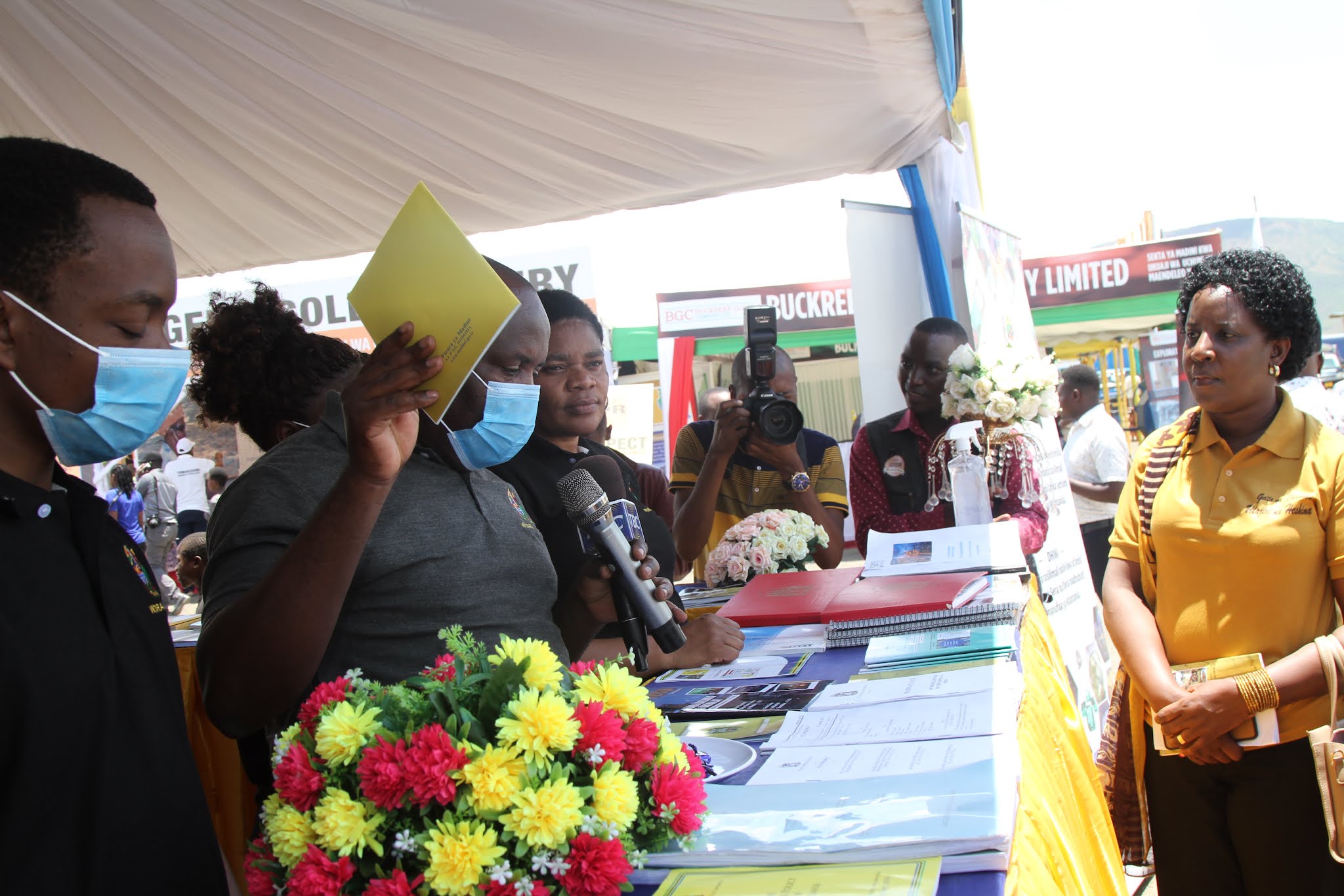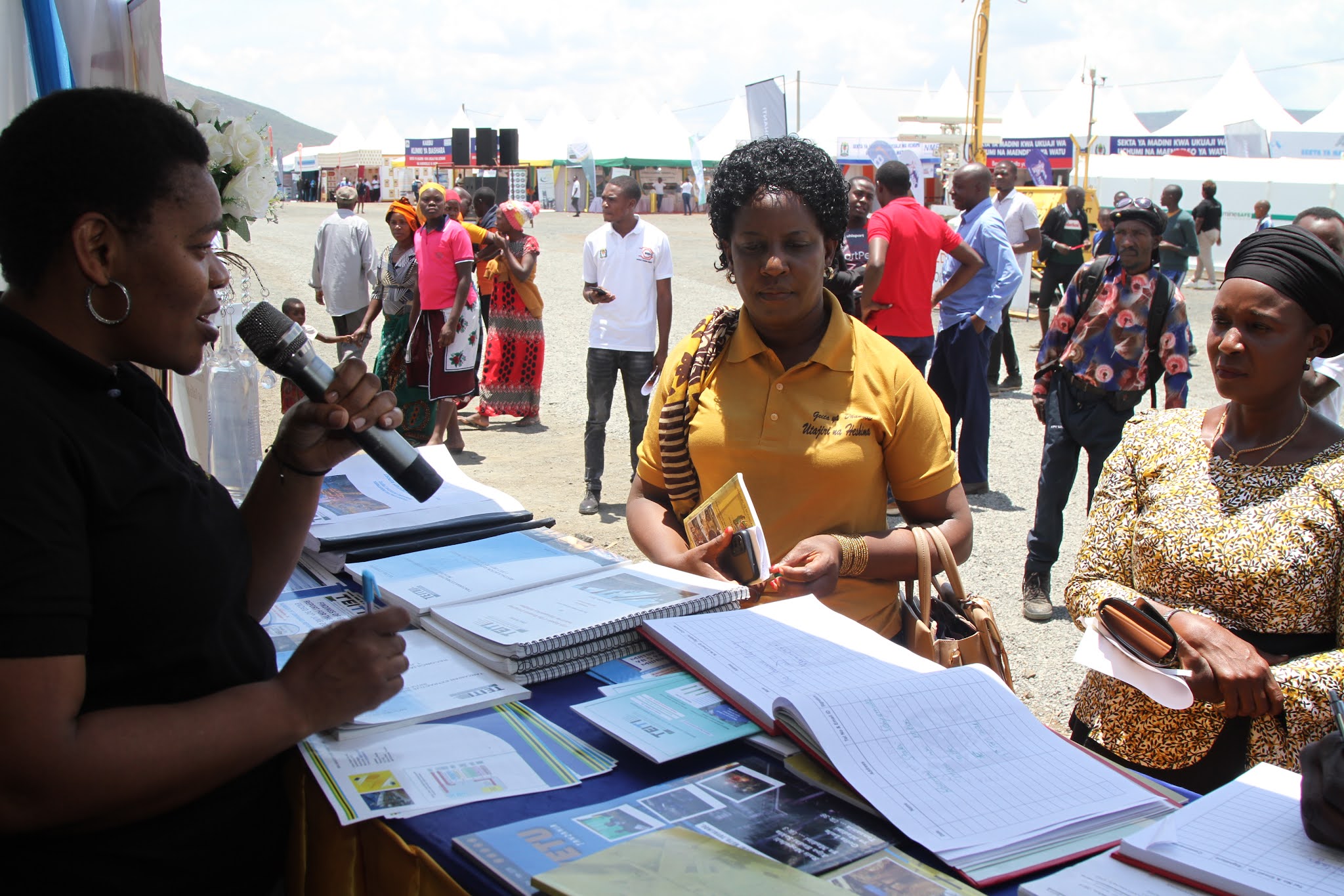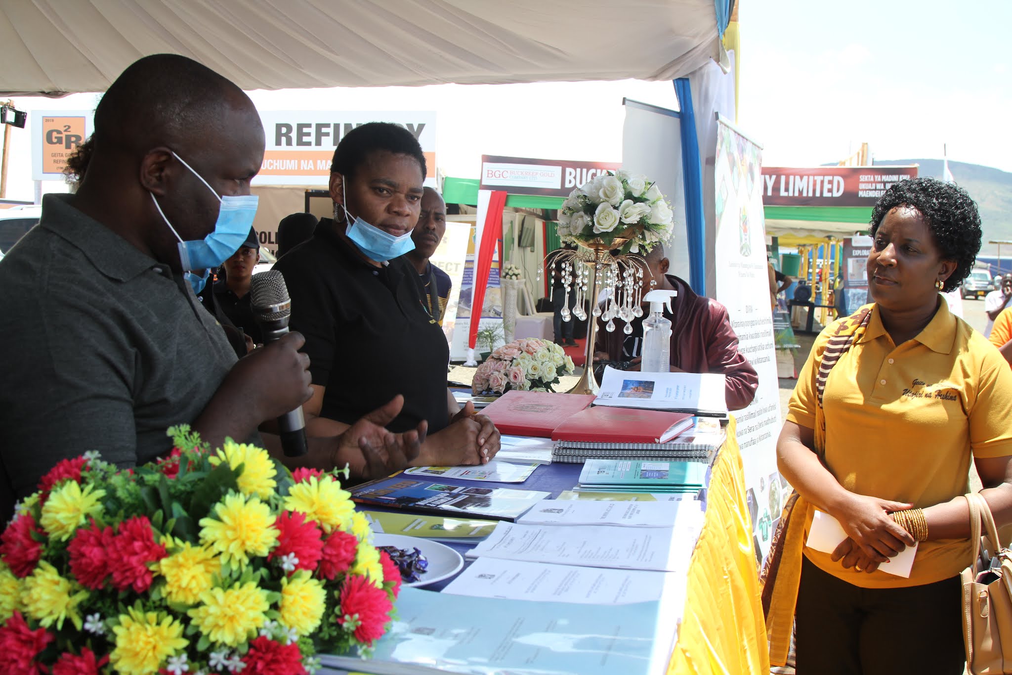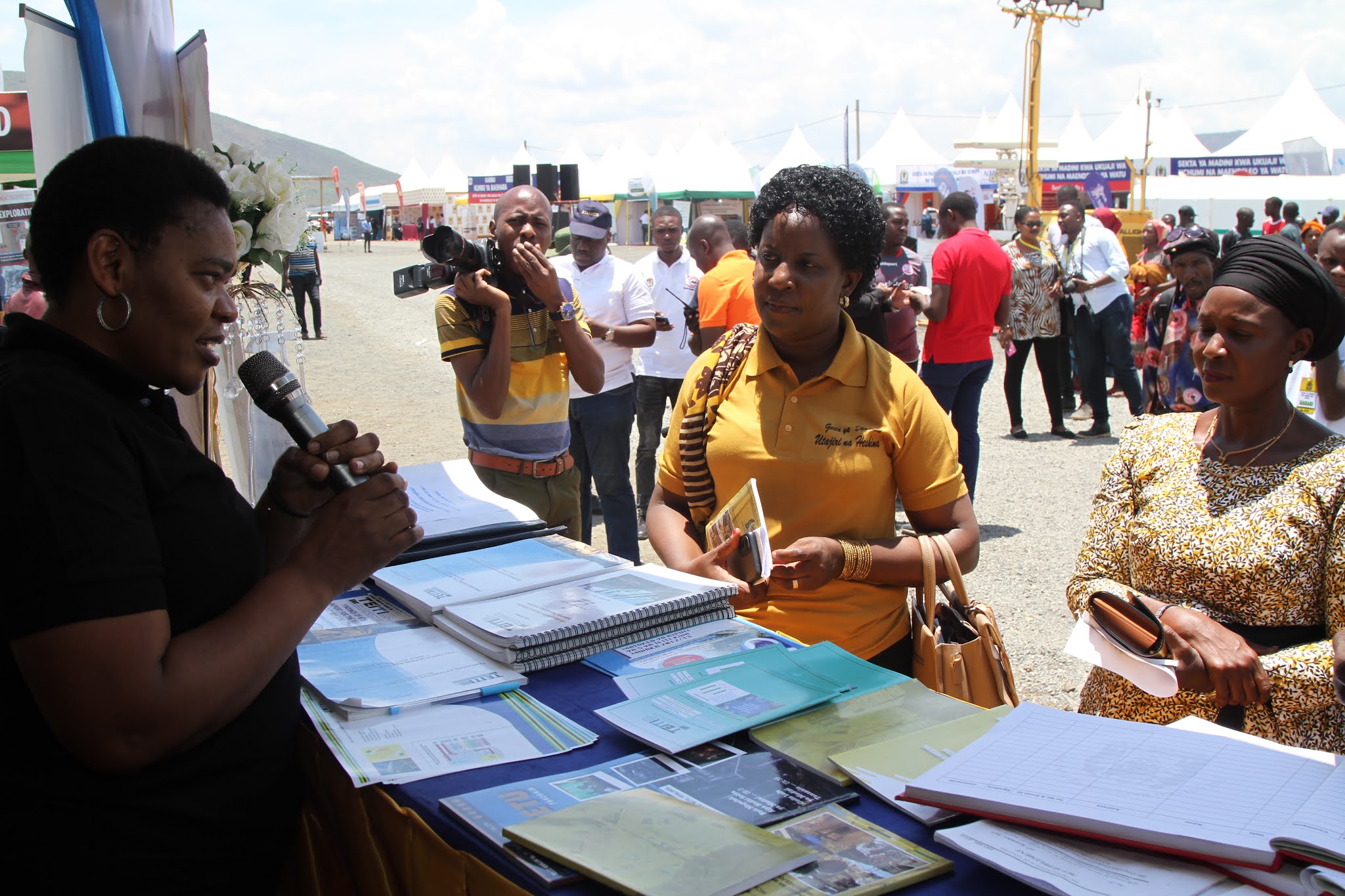 Kaimu Kamishna wa uongezaji thamani kutoka Wizara ya Madini Betha Luzabiko. (kushoto) akitoa maelezo kwa Mkuu wa Wilaya ya Nyamagana amina Makiragi (wa kwanza kulia) na Mkuu wa Mkoa wa Geita Rosemary Senyamule (wa pili kulia) walipokuwa kwenye Banda la Wizara ya madini kupata maelezo kutoka kwa mtaalamu huyo kuhusu mafanikio yaliyopatikana kwenye sekta hiyo kufuatia marekebisho ya sheria ya madini ya mwaka 2010 yaliyofanyika mwaka 2017.